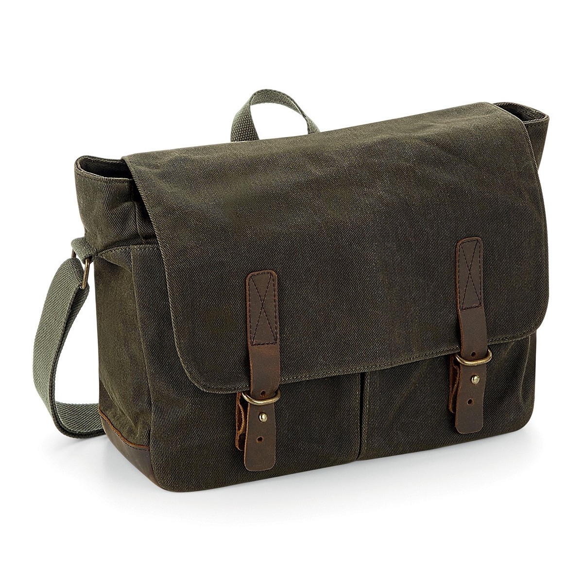 100% cotone canvas cerato resistente all'acqua. Borsa a tracolla con dettagli in vera pelle, scomparto principale con zip, due tasche frontali, chiusura con bottoni automatici, rifiniture effetto ottone anticato, completamente foderato, può contenere laptop fino a 14', manico in cotone. Dimensioni: 28x34x12 cm, capacità: 7 litri, area stampabile: 13x14 cm.