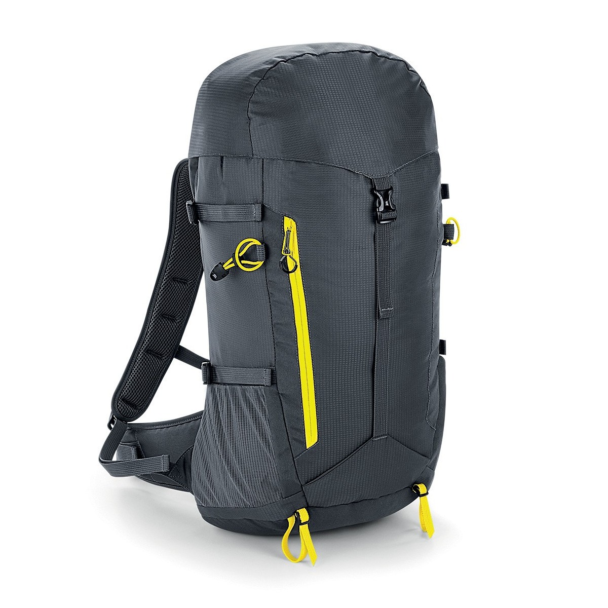100% poliestere 210D. Zaino ultraleggero con attacco per bastoni da trekking, tessuto resistente all'acqua, copertura impermeabile rimovibile, inserti riflettenti, tasca interna, tasche laterali in rete elastica, pannello posteriore ventilato a basso profilo. Etichetta strappabile. Dimensioni: 30x62x22 cm, capacità: 35 litri, area di stampa massima: 15x10 cm.
