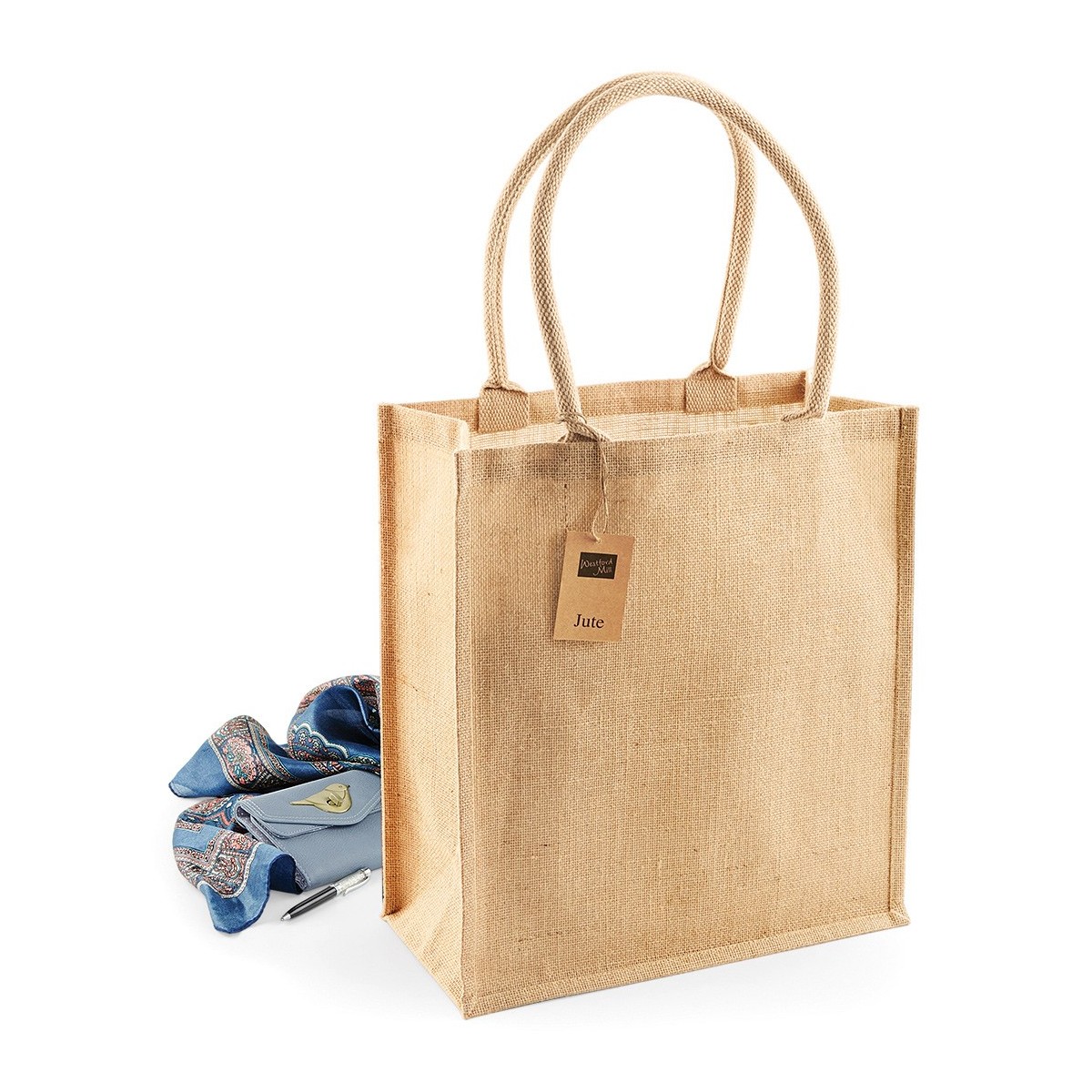 100% juta laminata, manici in cotone, puo' essere portata a mano o in spalla. Lunghezza del manico: 65 cm Dimensioni: 36 x 41 x 17 cm Capacita': 19 litri