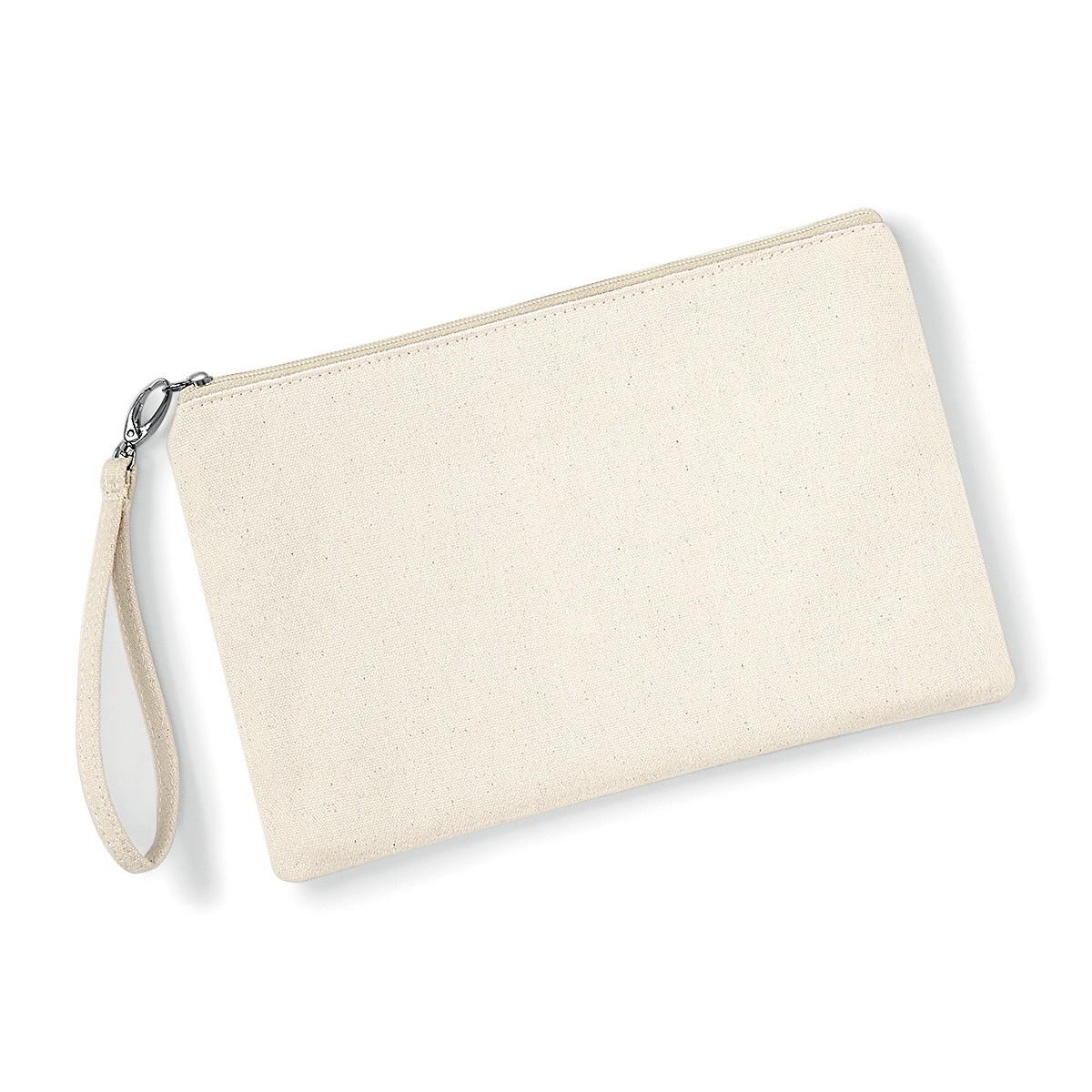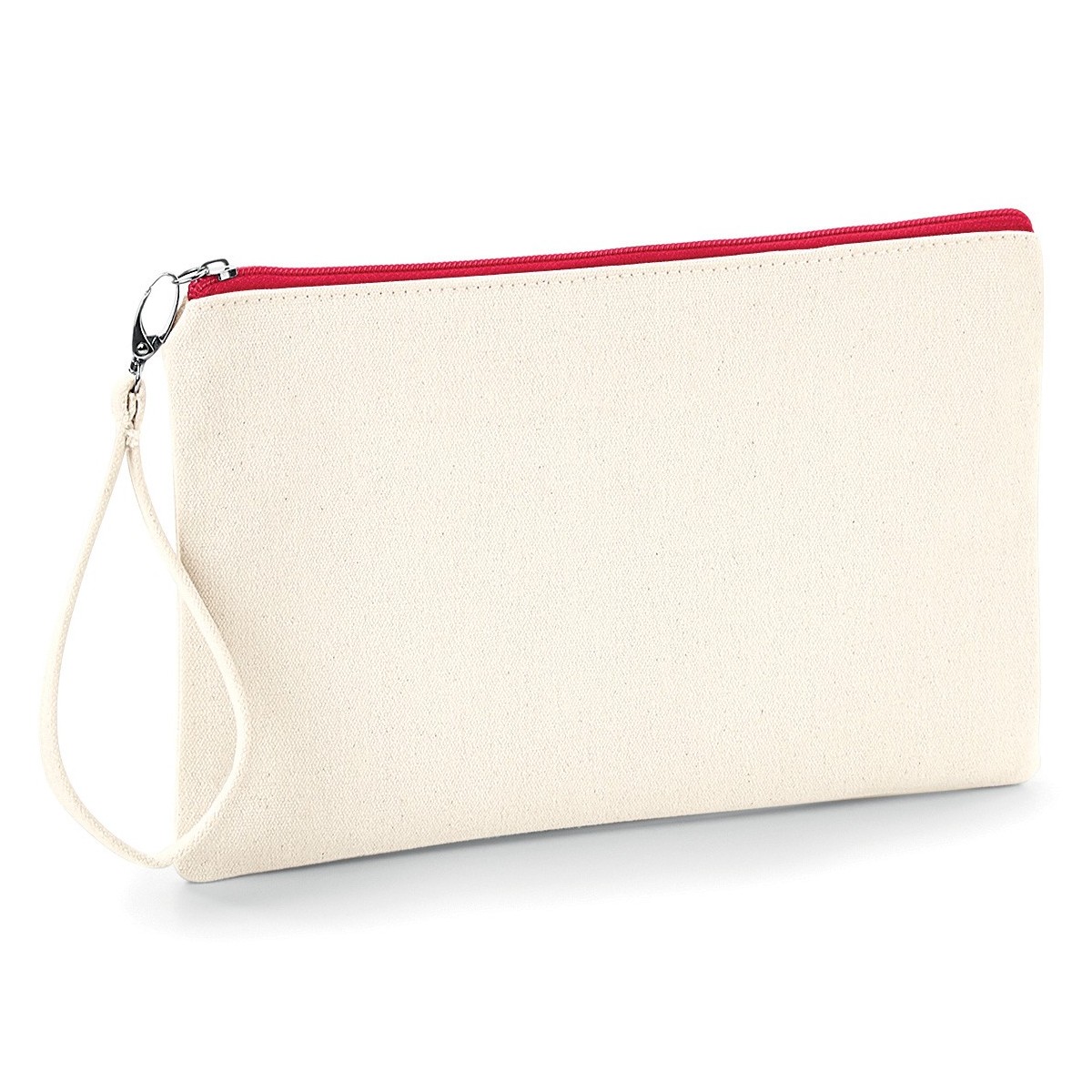 100% cotone Canvas. Pochette multiuso con zip con colore a contrasto, cinturino da polso staccabile, chiusura con zip. Lunghezza manico: 15 cm. Dimensioni: 26x17 cm, capacità: 1 litro, area stampabile: 21x13 cm.