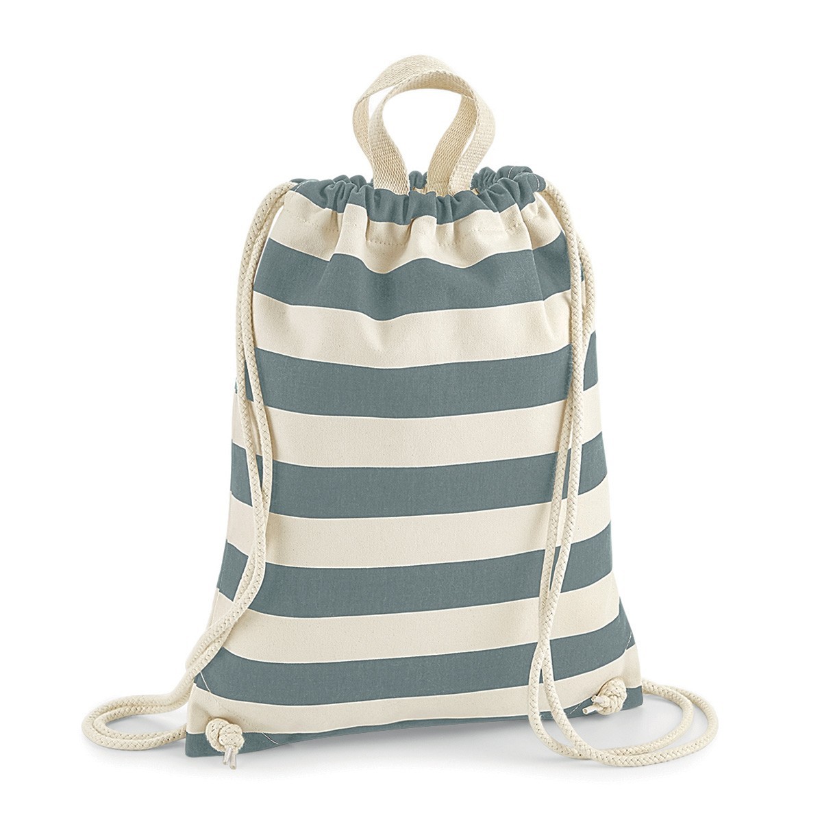 100% Cotone Canvas pettinato. Gymsac con motivo stampato a strisce, maniglia doppio uso/anelli portaoggetti. Chiusura a sacchetto con robusto cordoncino. Dimensioni 37x46 cm. Capacità 12 litri. Area di stampa 30x32 cm.