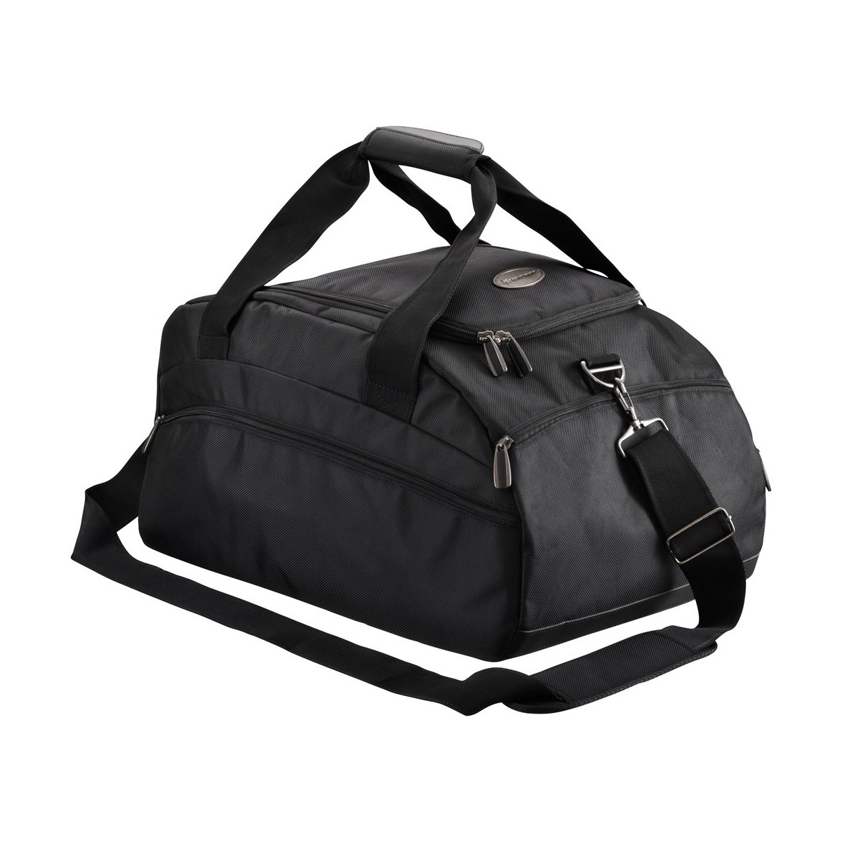 Pratica tasca interna ed esterna con molte possibilità di stivaggio, scomparto per indumenti umidi, fodera interna in pregiato nylon, cinghia tracolla imbottita con applicazioni in finta pelle, scomparto principale con chiusura in velcro e possibilità di applicazione della pubblicità