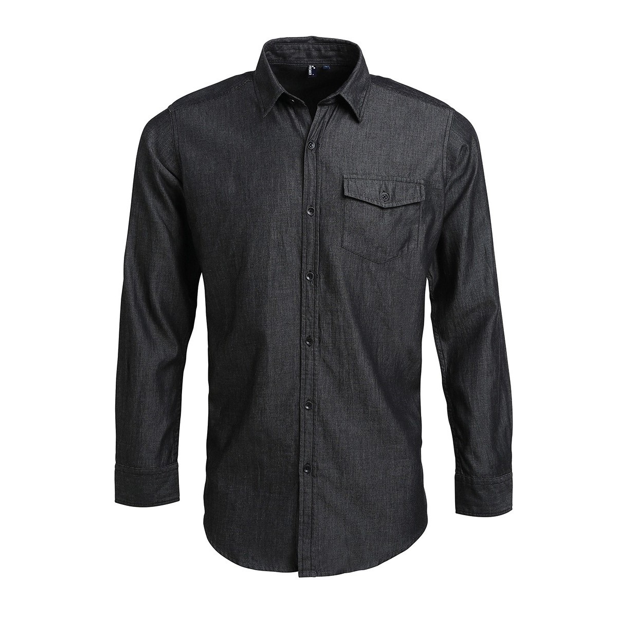 100% cotone denim, camicia uomo manica lunga con taschini sul petto, chiusura con bottoni sui polsini e orlo arrotondato