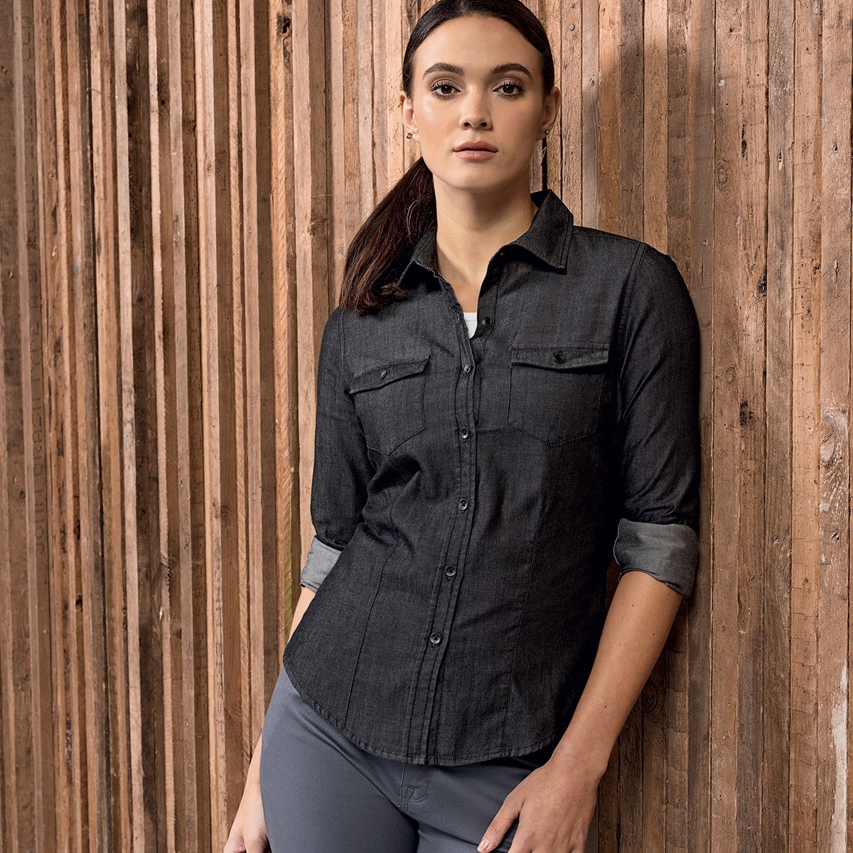 100% cotone denim, camicia donna manica lunga con taschini sul petto, chiusura con bottoni sui polsini e orlo arrotondato sul fondo, leggermente sfiancata ai lati.