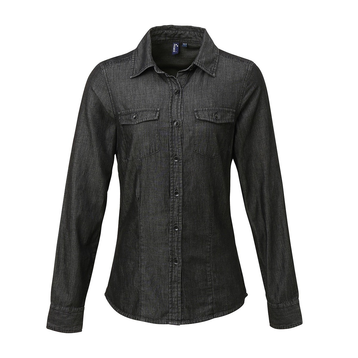 100% cotone denim, camicia donna manica lunga con taschini sul petto, chiusura con bottoni sui polsini e orlo arrotondat