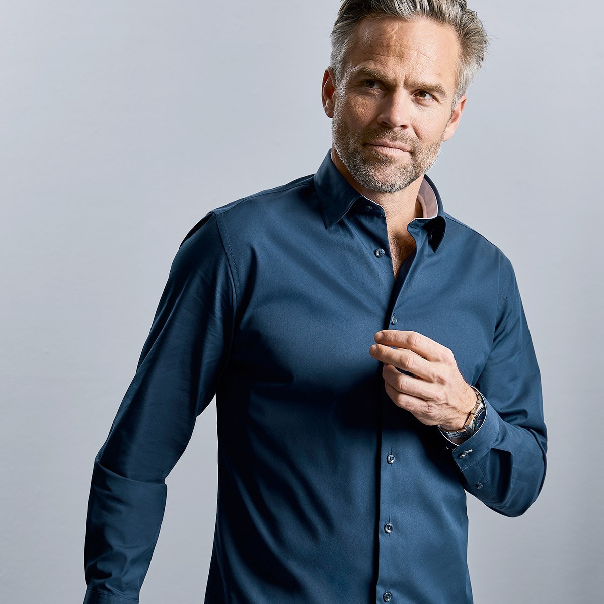 75% cotone, 25% elastomultiestere (fibra LYCRA® T400). Camicia a maniche lunghe da uomo in tessuto resistente, colori a contrasto, polsini regolabili a 2 bottoni con occhiello per gemelli. (col. 30: 125 g/m).