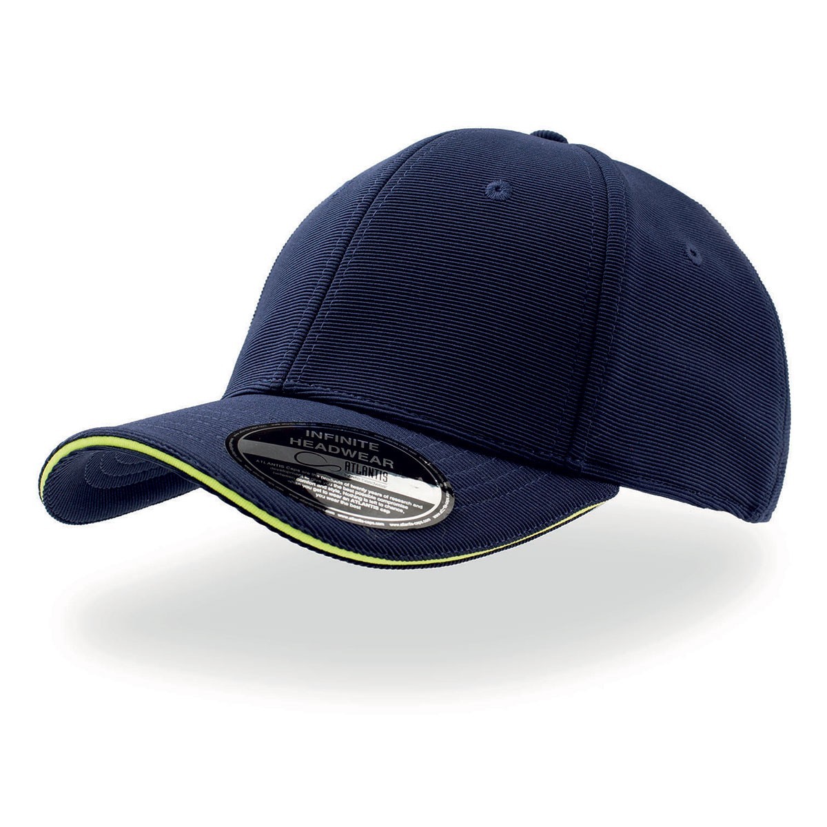 100% poliestere. Cappellino a 6 pannelli, con occhielli ricamati, pannello frontale rinforzato, visiera pre-curvata e con sei cuciture, parasudore elasticizzato, fodera a contrasto su pannelli frontali. Disponibile in due misure: S/M e L/XL.