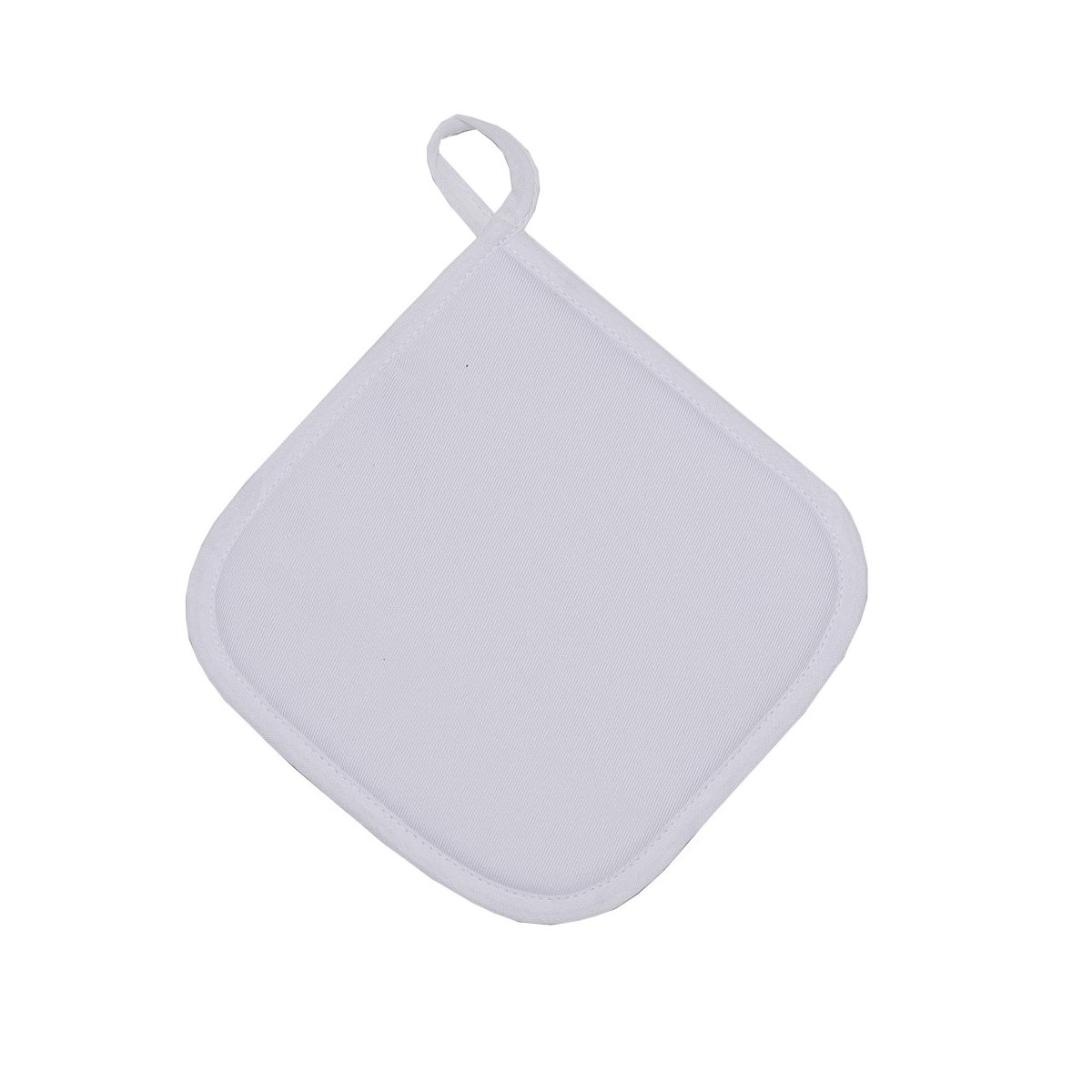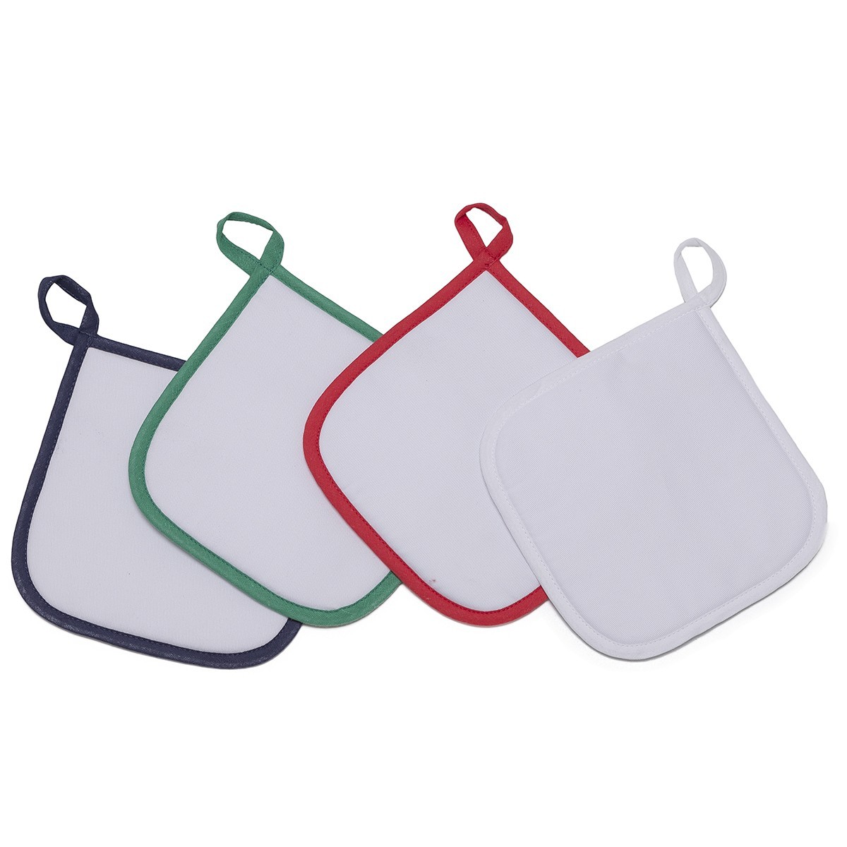 80% poliestere, 20% cotone. Presina con orlo di colore contrastante. Tessuto adatto alla sublimazione. Dimensioni: 16,5 x 16,5 cm.
