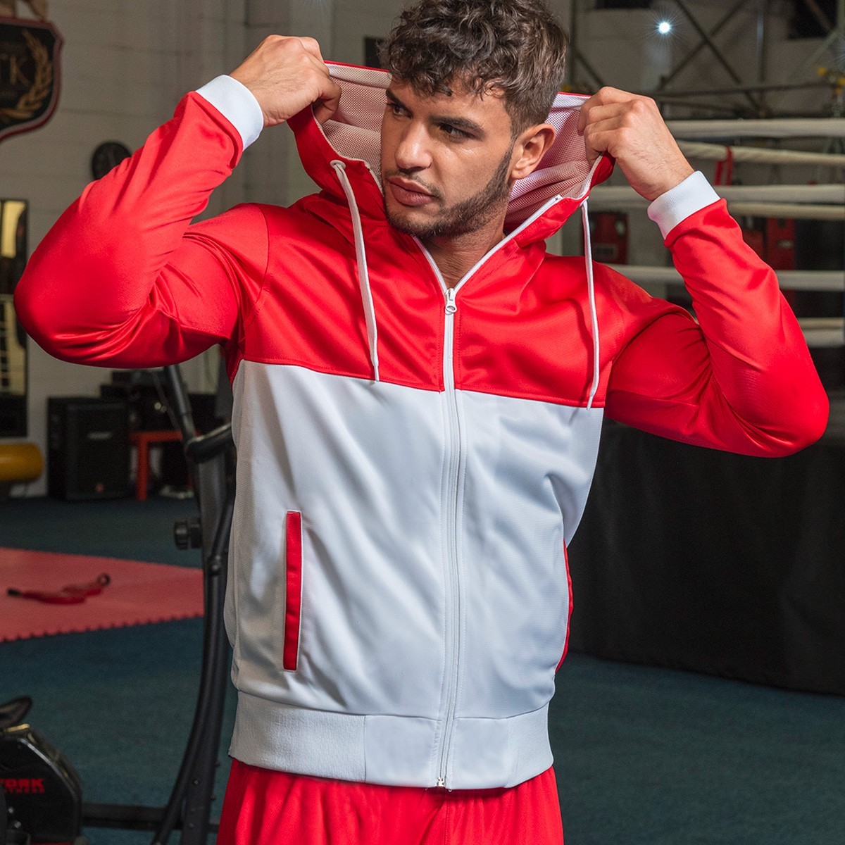 100% poliestere. Felpa con maniche set-in, parte inferiore del busto, polsini, cerniera, parte interna del cappuccio e cordoncini di colore contrastante, due tasche frontali, etichetta strappabile, struttura con cuciture laterali, felpata internamente.