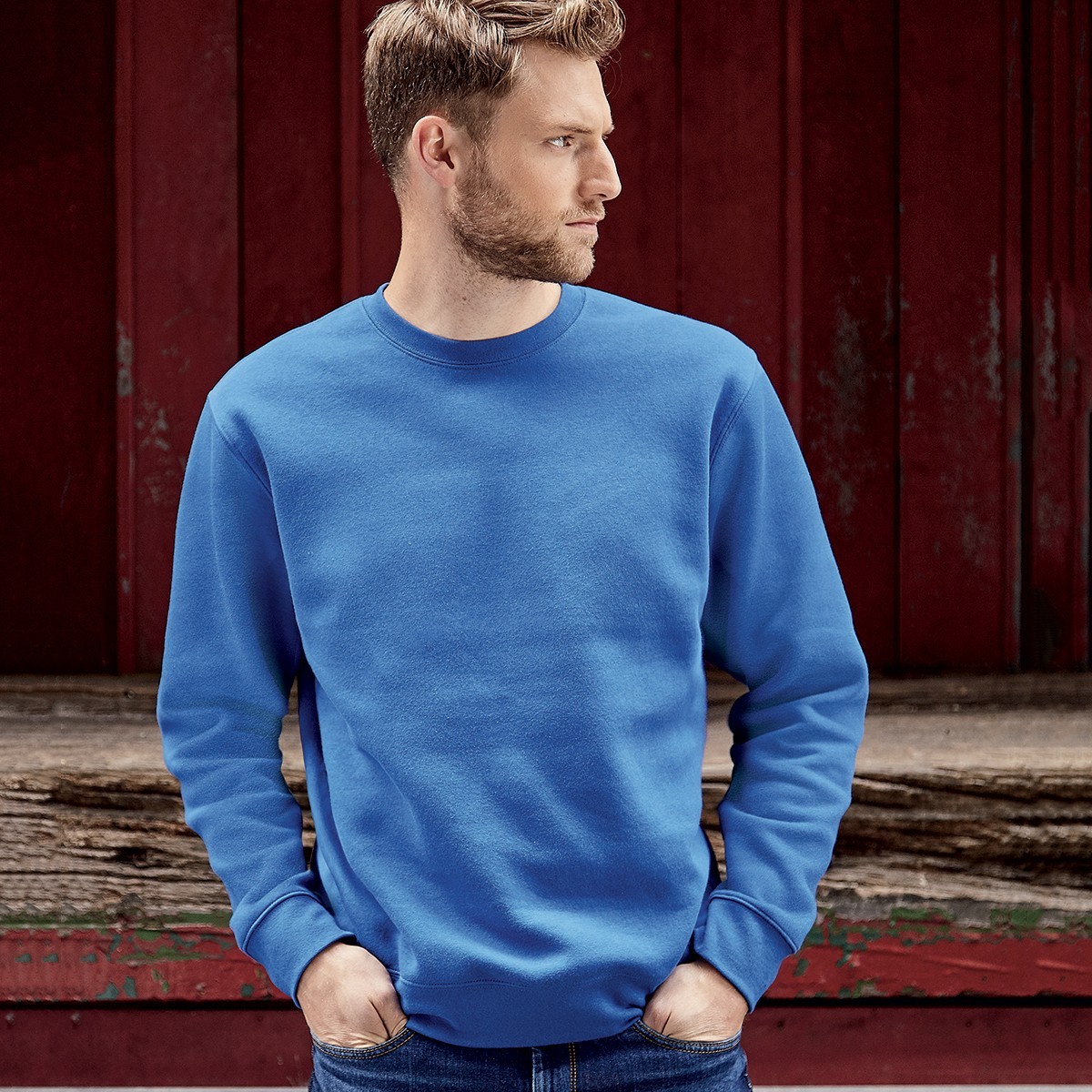 80% cotone pettinato ring-spun, 20% poliestere. Felpa con maniche set-in, tessuto a 3 strati, fettuccia sul collo a spina di pesce, felpata internamente, struttura con cuciture laterali.