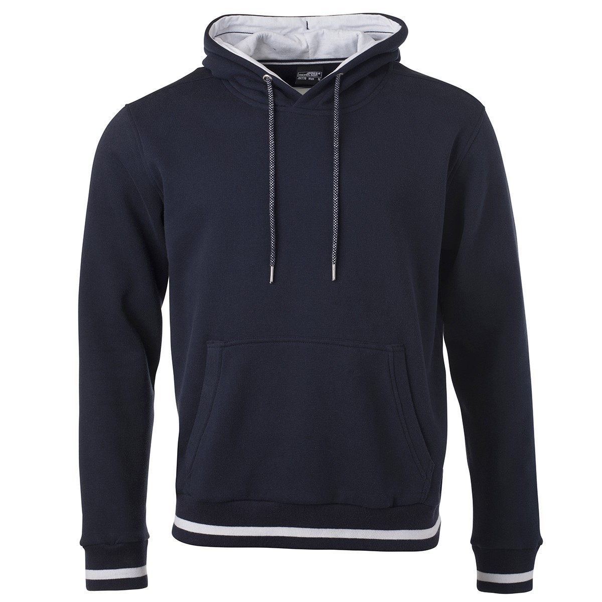 Felpa trendy con cappuccio. Tessuto esterno (300 g/m²): 80% cotone, 20% poliestere. Tessuto morbido e di alta qualità, internamente ruvido, polsini a maglia di elastan, strisce contrastanti nei polsini e in vita, cappuccio a due strati contrastanti, tasca canguro.