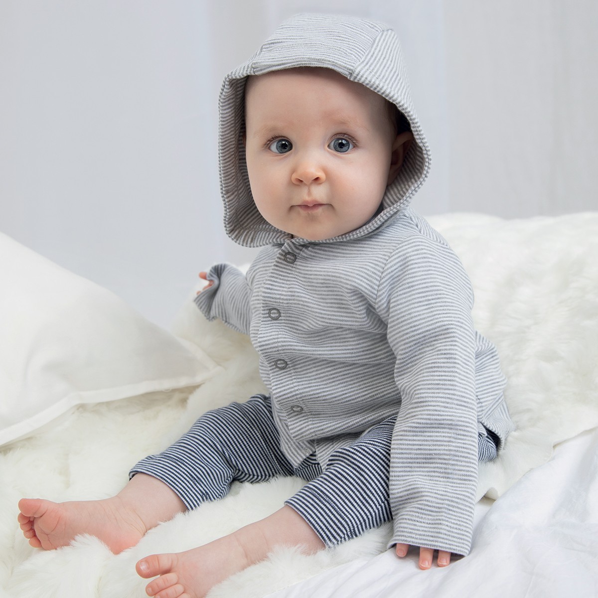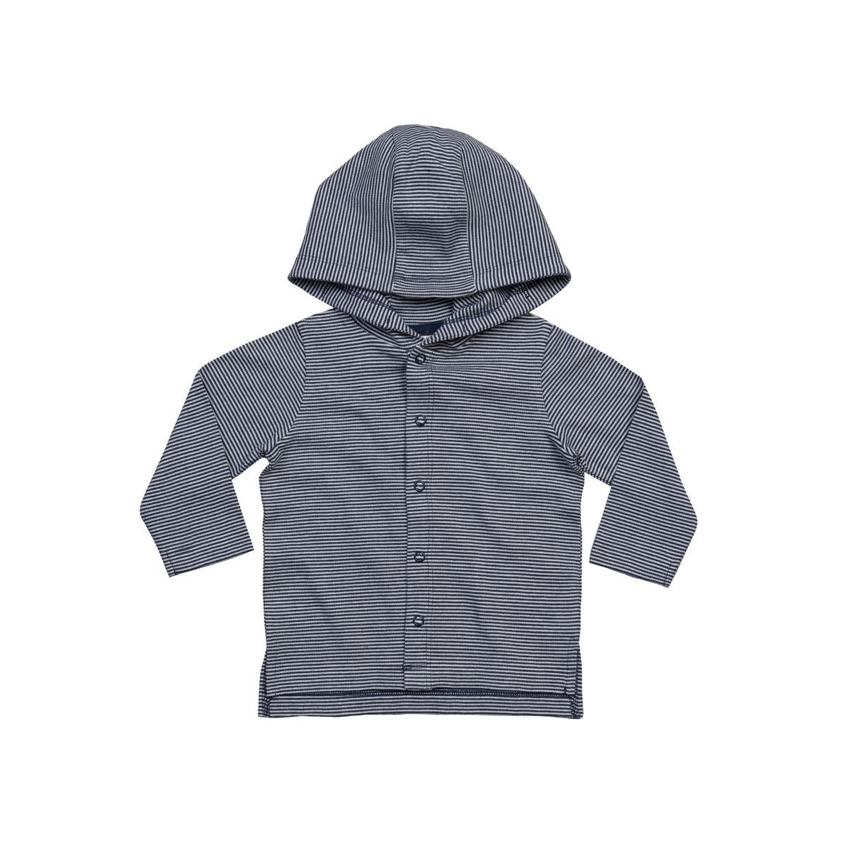 100% cotone organico. Felpa con maniche set-in in tessuto morbido ed elastico, fantasia a righe in contrasto, 5 bottoncini a pressione colorati, cappuccio foderato a 3 pannelli, struttura con spacchetti laterali, nastro di rinforzo al collo, etichetta strappabile. WH/HGM: 92% cot. organico, 8% vis.