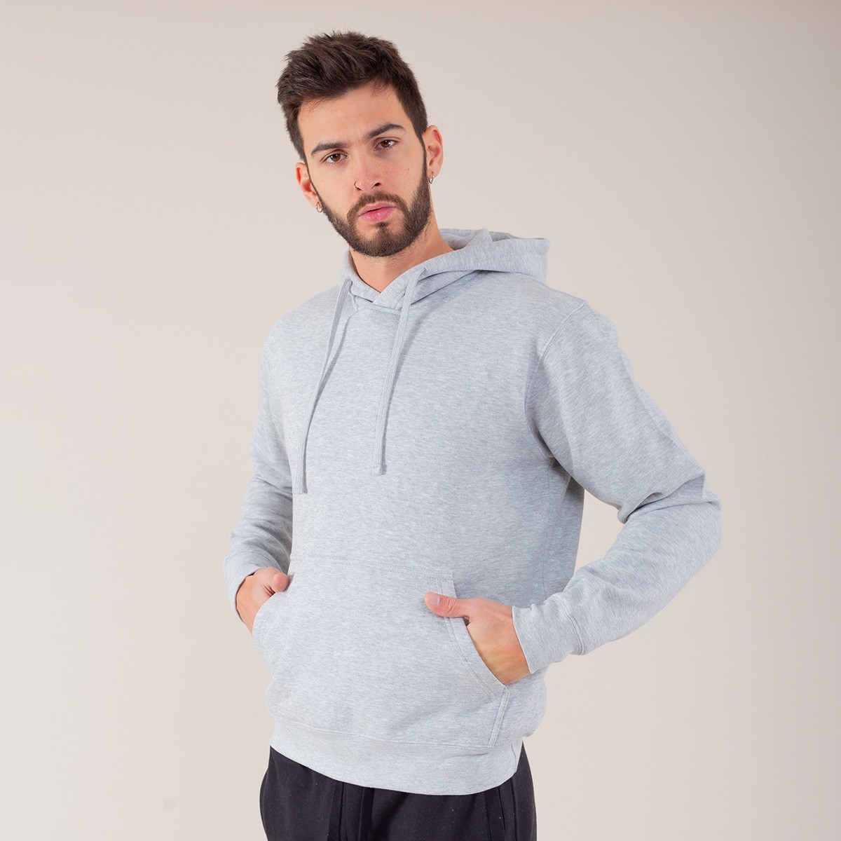 70% cotone, 30% poliestere. Felpa con maniche set-in, unisex a tre strati, felpata internamente, cappuccio a doppio strato, grande tasca a marsupio, struttura con busto tubolare, fascia in vita e polsini in costina, tessuto PST. Etichetta strappabile.
