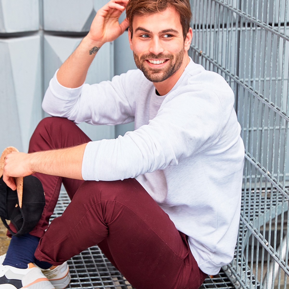 80% cotone, 20% poliestere. Felpa da uomo con necktape, rivestita internamente, bande sulle maniche in elastane, etichetta strappabile.