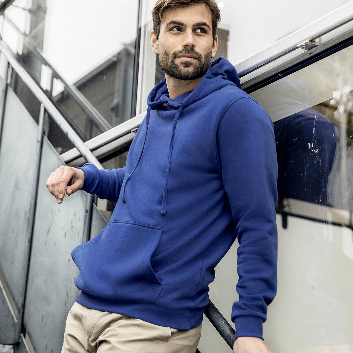 80% cotone, 20% poliestere. Felpa da uomo con rivestimento interno, cappuccio doppio strato con coulisse, tasca a canguro, necktape, bande nelle maniche in elastane, etichetta removibile.