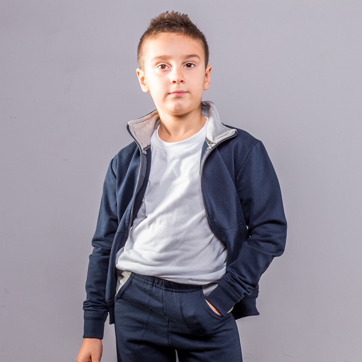 70% cotone, 30% poliestere. Felpa sgarzata, maniche lunghe set-in, parte interna del colletto di colore contrastante, tasca a marsupio, zip intera.
