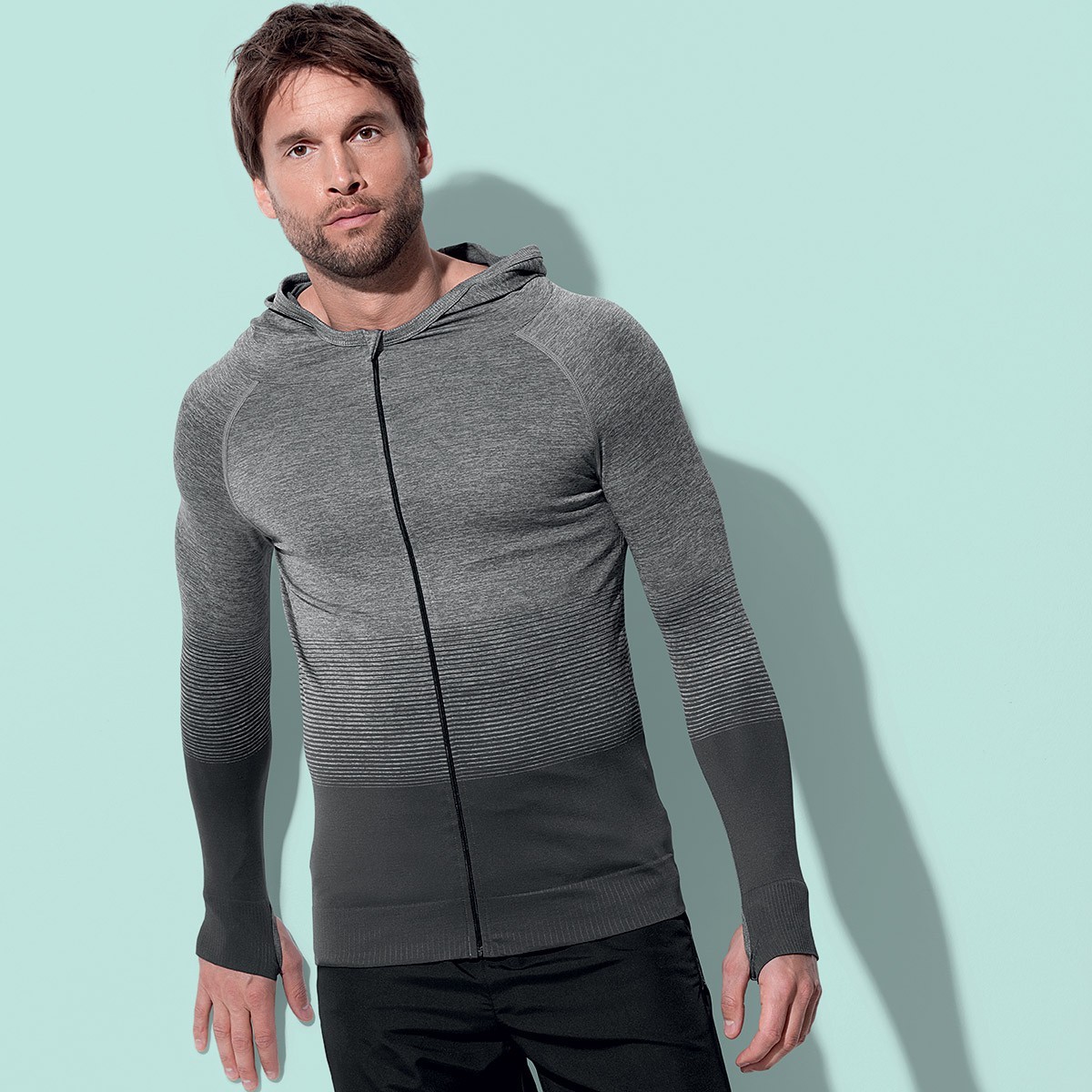 75% nylon, 25% poliestere. Giacca con cappuccio da uomo in tessuto elasticizzato e resistente, cerniera con protezione per il mento, maniche raglan, fori per i pollici, modello con sfumature multicolore, vestibilità aderente.