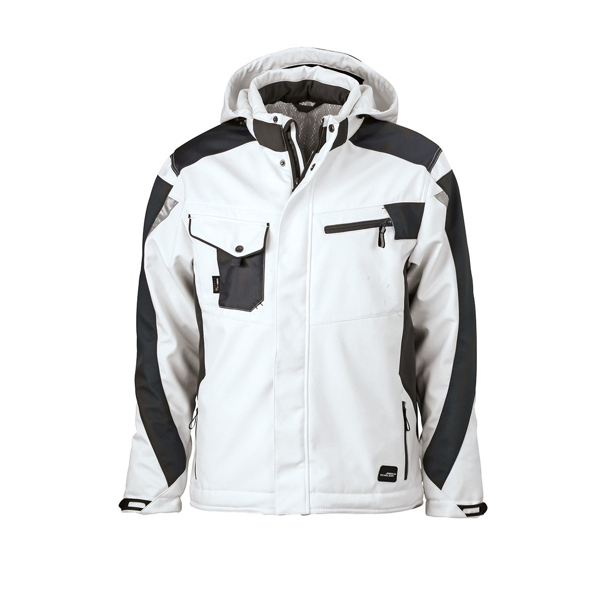 100% poliestere. Giacca in softshell professionale con caldo rivestimento interno, tessuto robusto, antivento, traspirante e impermeabile. Colletto rigido, interno in pile, cappuccio regolabile e rimovibile, rinforzo alle spalle con cordura, tasche multi-funzionali, dettagli catarifrangenti sulle maniche e sul retro.