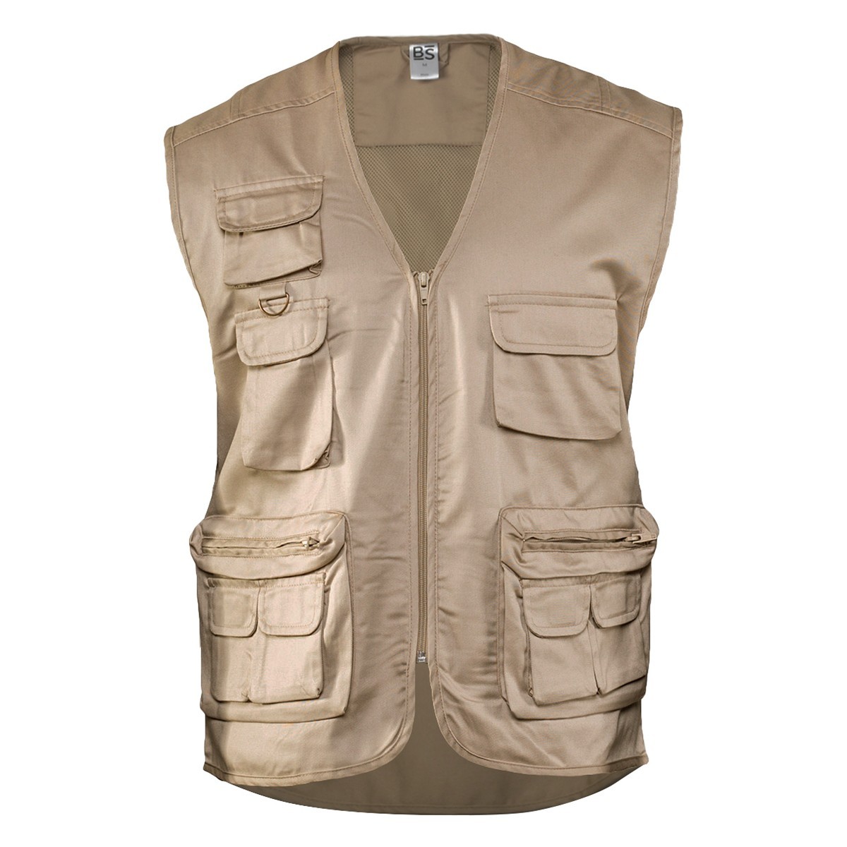 65% poliestere, 35% cotone. Gilet collo a V, 9 tasche anteriori incluso taschino per cellulare. Fodera interna in rete di nylon.
