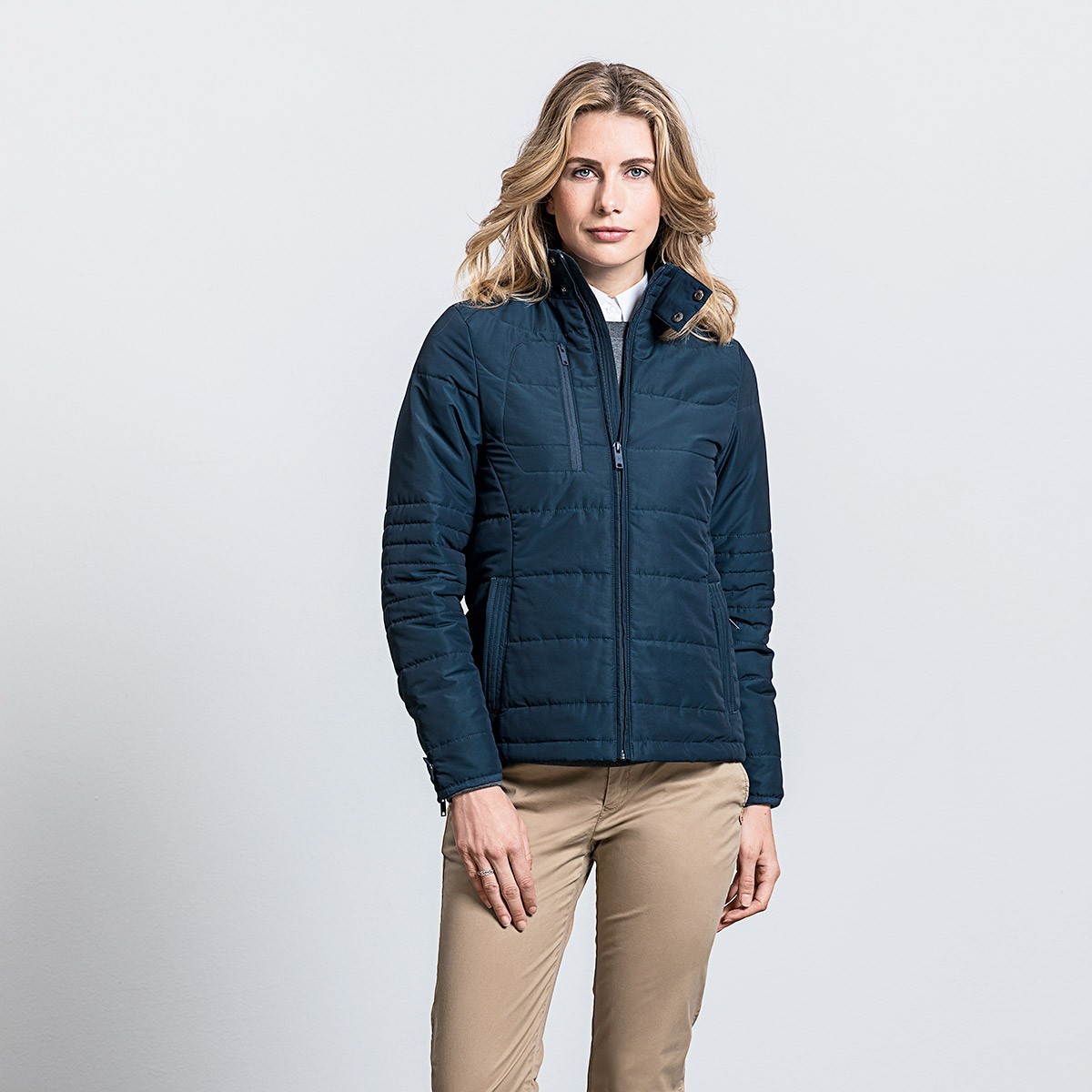 100% poliestere, tessuto DWR ad alte prestazioni trattato con Aquapel di Nanotex,senza fluoro e PFC Giacca donna con imbottitura ecologica di Dupont Sorona. Taglio moderno. Collo montante con 2 bottoni a pressione e pattina frangivento interna per la protezione dal vento, tasca interna con zip, pattina decorativa per la manica con bottone a pressione. Accesso discreto per la decorazione sul lato sinistro interno del torace.