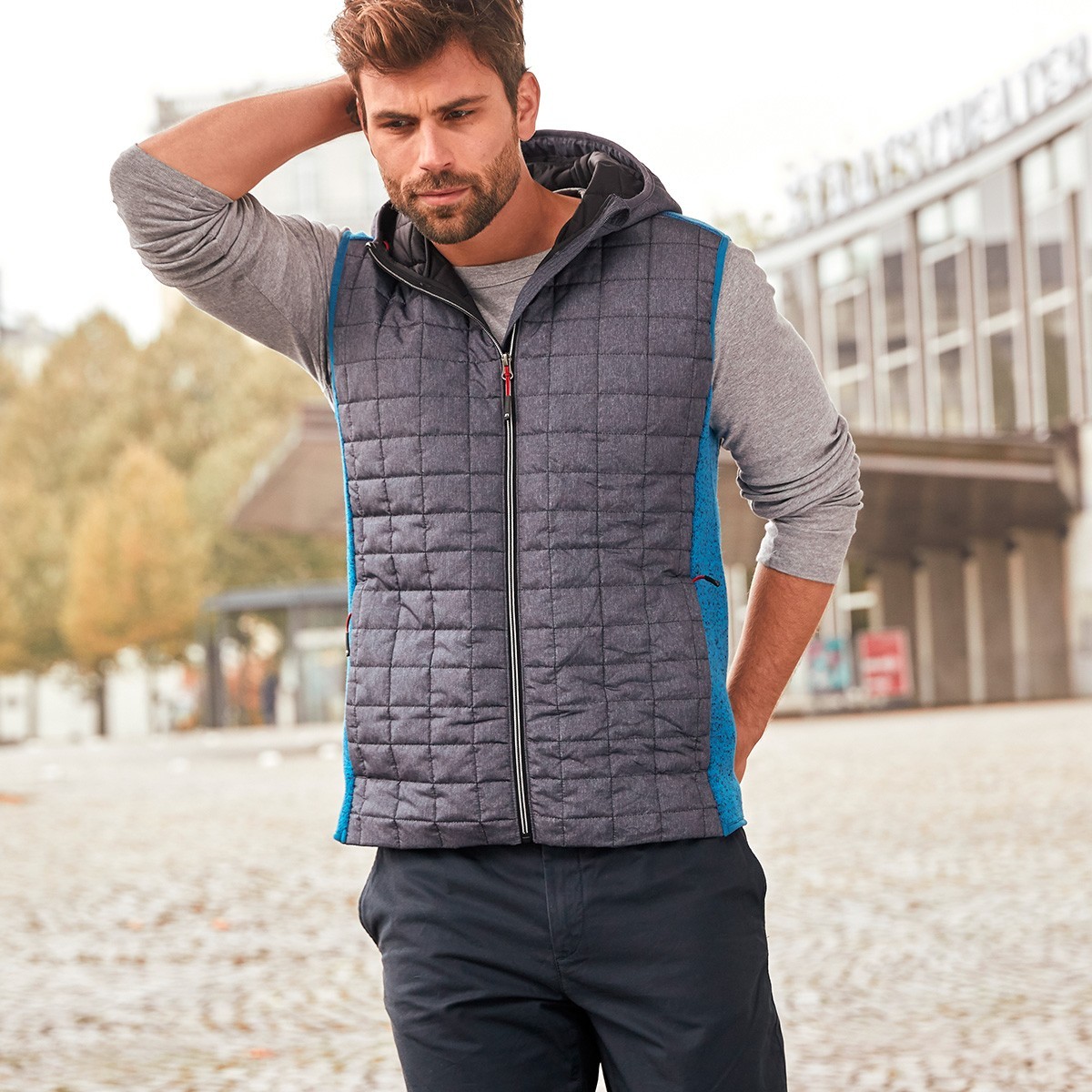 Tessuto esterno: 100% poliestere, rivestimento: 100% poliammide, imbottitura: 100% poliestere. Gilet in tessuto morbido, caldo e di facile manutenzione in look melange, cappuccio regolabile internamente, chiusura con zip intera, tasche laterali con zip, 2 tasche interne.