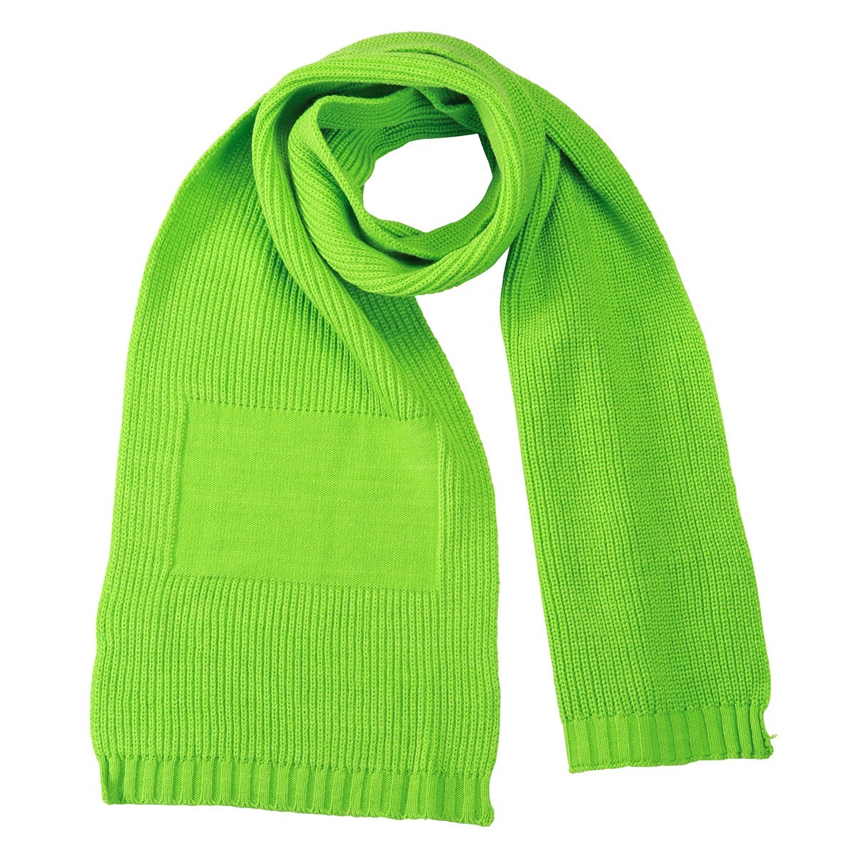 Sciarpa a maglia 100% poliacrilico. Spazio ad una estremità della sciarpa per la personalizzazione di 20 x 12 cm. Dimensioni totali: 180 x 30 cm.