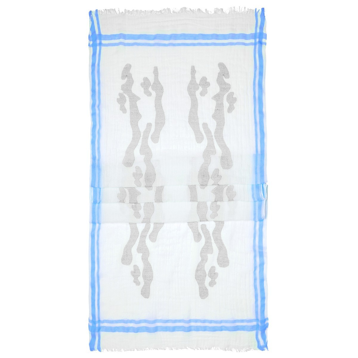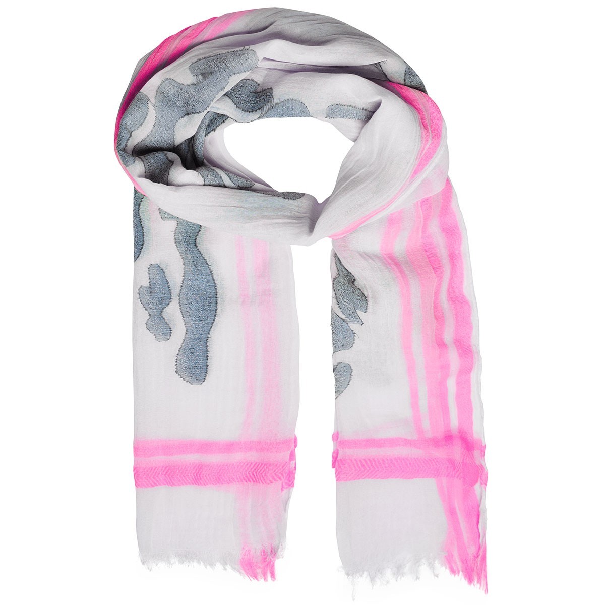 80% cotone, 20% poliestere. Sciarpa dal tessuto morbido e piacevole da indossare, righe in colori a contrasto sulle estremità, orli arrotolati sui bordi longitudinali, tessuto sfrangiato sulle estremità. Dimensioni: 180 x 63 cm.