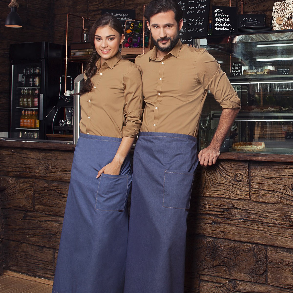 65% poliestere, 35% cotone. Grembiule di jeans, doppie cuciture, cuciture contrastanti, tasca (17,5 x 19 cm) sul lato sinistro, adatto al lavaggio industriale.