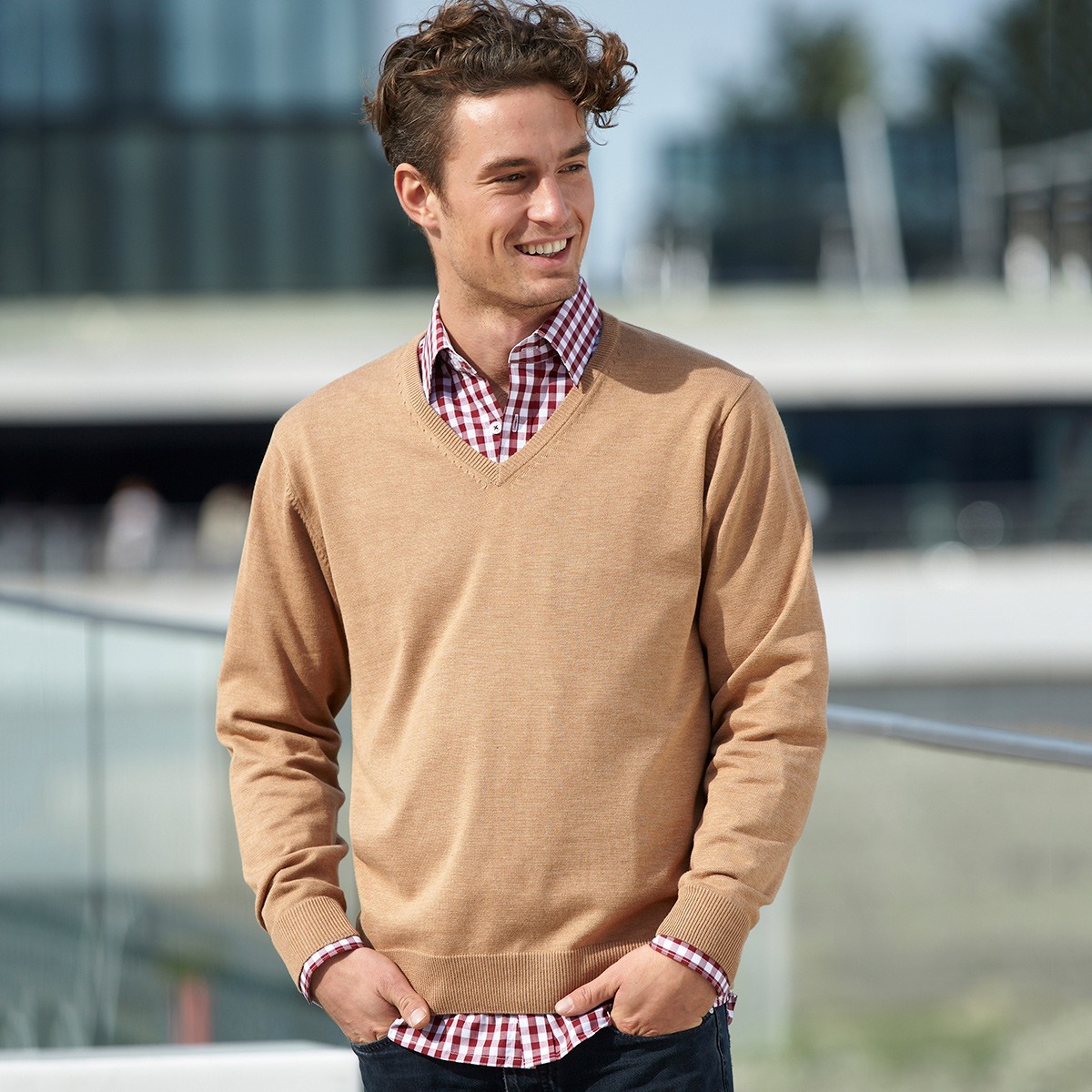 100% cotone pettinato, pullover uomo con tessuto in maglia leggera, scollo a V. Lavabile in lavatrice. Cuciture laterali