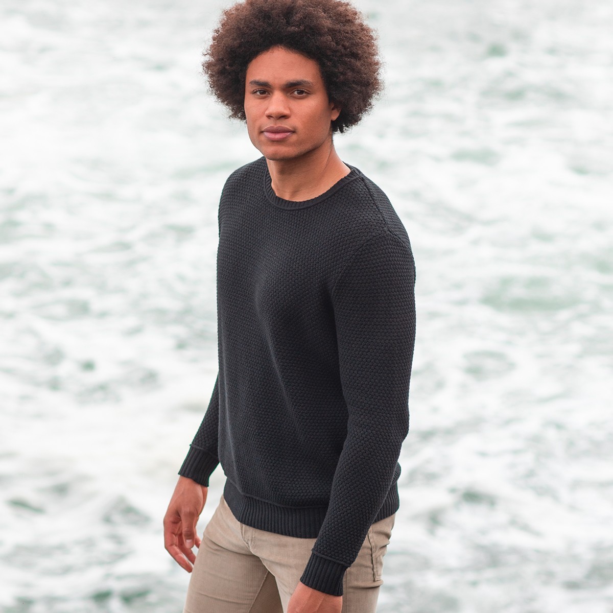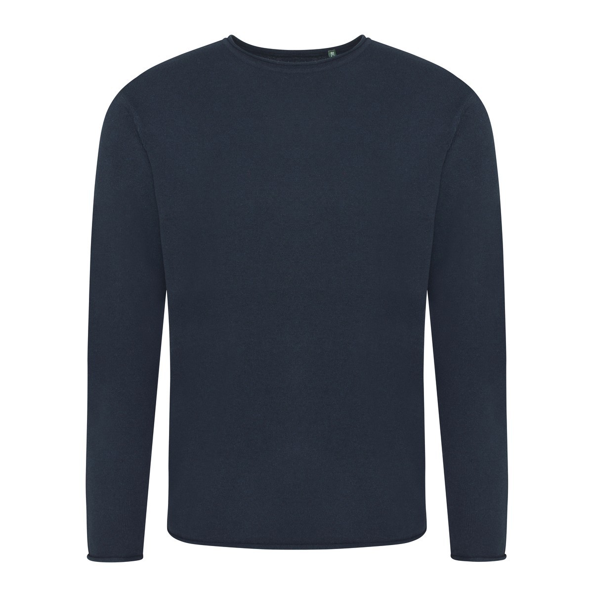 70% Cotone rigenerato, 30% poliestere riciclato. Maglione girocollo, maniche a giro, polsini e collo a costine, maglia in punto riso. Etichetta strappabile.