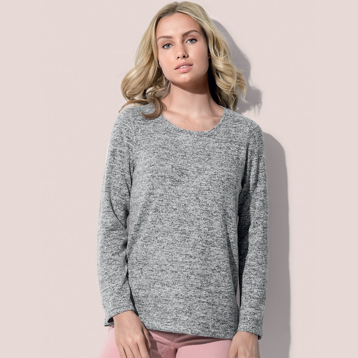 58% poliestere, 37% viscosa, 5% elastane. Pullover manica lunga da donna, cuciture laterali, disponibile in diversi colori melange.