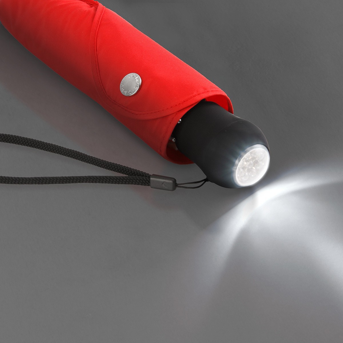 Copertura: 100% poliestere, manico: plastica, asta: acciaio. Ombrello dotato di fodera in materiale 3M Scotchlite Reflective sugli angoli degli spicchi e impugnatura soft-touch con LED orientabile, testa luminosa regolabile, sistema Windproof, leva di sicurezza. Diametro: 98 cm, lunghezza da chiuso: 28 cm, 6 pannelli.