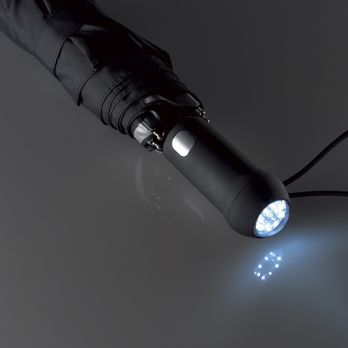 Fodera con materiale 3M Scotchlite Reflective sugli angoli degli spicchi e impugnatura con LED orientabile per una visibilità ottimale nel traffico, testa luminosa regolabile (luce bianca continua oppure luce rossa lampeggiante), confortevole doppia funzione automatica per un'apertura rapida, pregiato sistema Windproof per una massima flessibilità del telaio con stecche Fibertec® estremamente flessibili in caso di forti raffiche di vento, proprietà della fodera idrofughe e autopulenti grazie al rivestimento in tessuto originale DuPont Teflon®, impugnatura con possibilità di applicazione della pubblicità, premiato con il riconoscimento ''reddot design award honourable mention'' 2012'. Diametro: 97 cm, lungheza da chiu so: 32 cm, 7 pannelli.