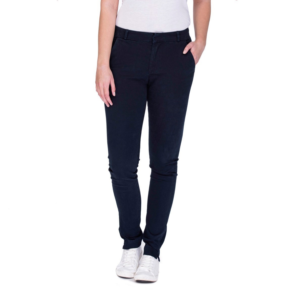 98% cotone, 2% elastan, pantaloni donna skinny fit. Tasche frontali e posteriori con bottone di chiusura. Passanti per c