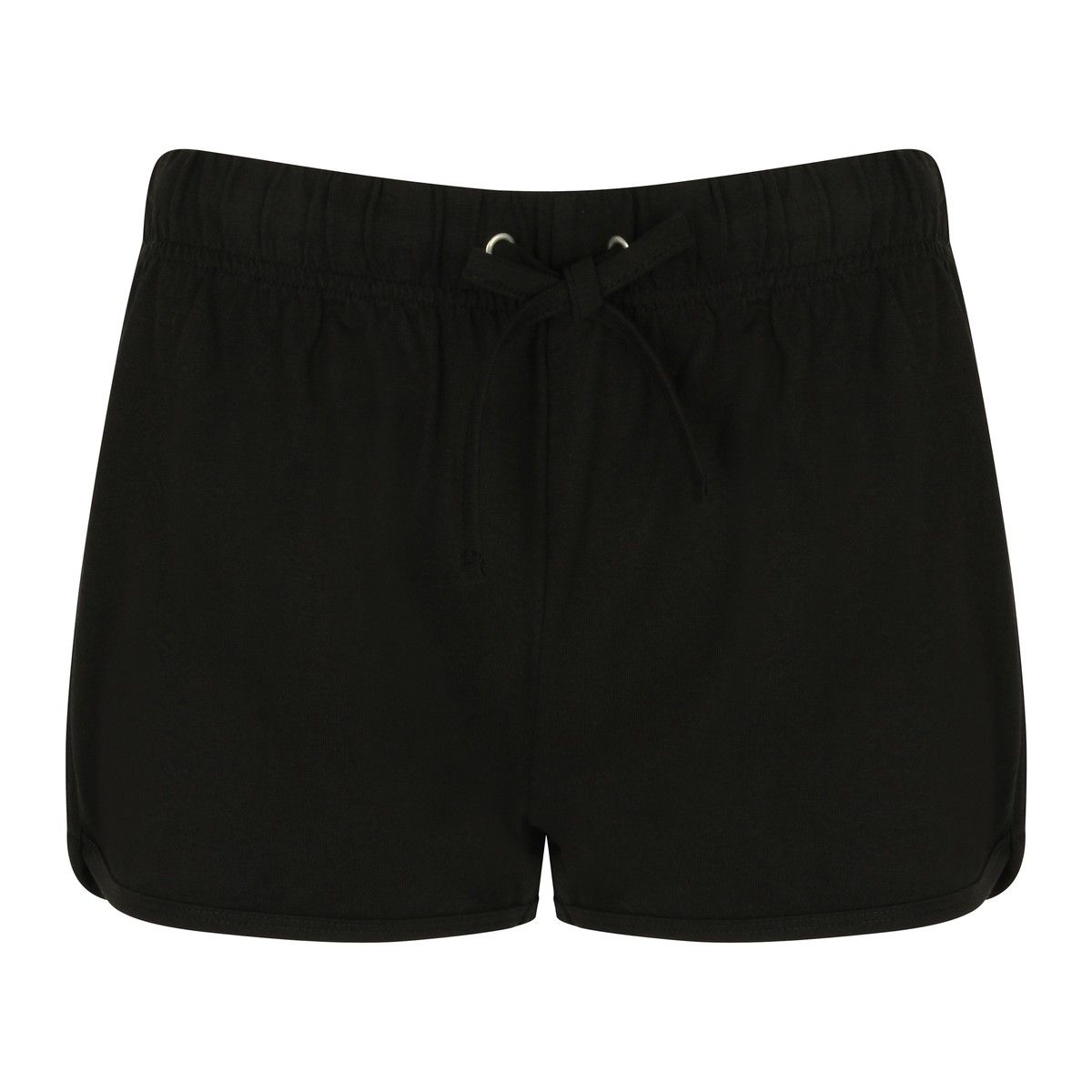 100% cotone single jersey. Pantaloncini vintage, orlo stondato, elastico in vita con cordoncino in tessuto di colore con