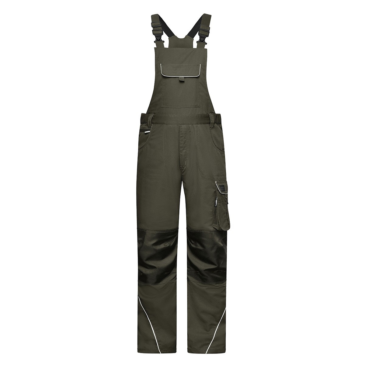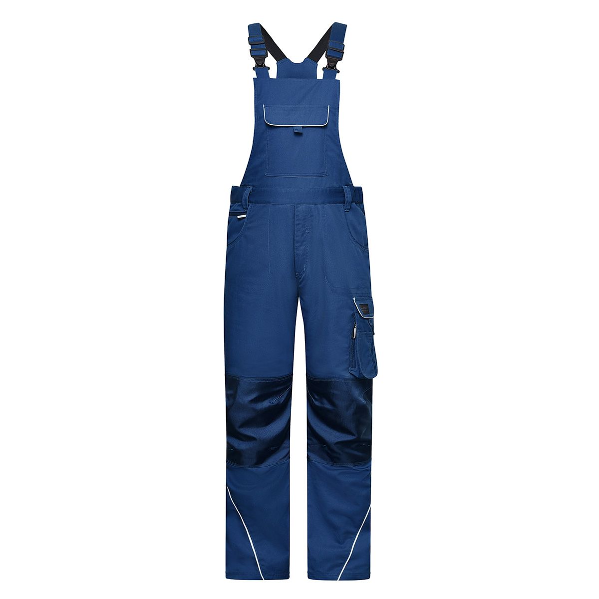 65% poliestere 35% cotone, rifiniture 100% poliammide. Salopette da lavoro in tessuto misto confortevole, resistente e robusto, girovita elastico con passanti per cintura, rinforzo CORDURA sulle ginocchia, triple cuciture, tasche frontali, tasche porta attrezzi, tre tasche con zip, taschino per cellulare e taschini porta penne, dettagli riflettenti (senza funzione protettiva / senza DPI) sulle tasche, sul davanti e sul retro, zip YKK, lavabile a 60° C e ideale per asciugatura in asciugatrice. Per evitare che il prodotto si rovini, bottoni e zip sono nascosti.