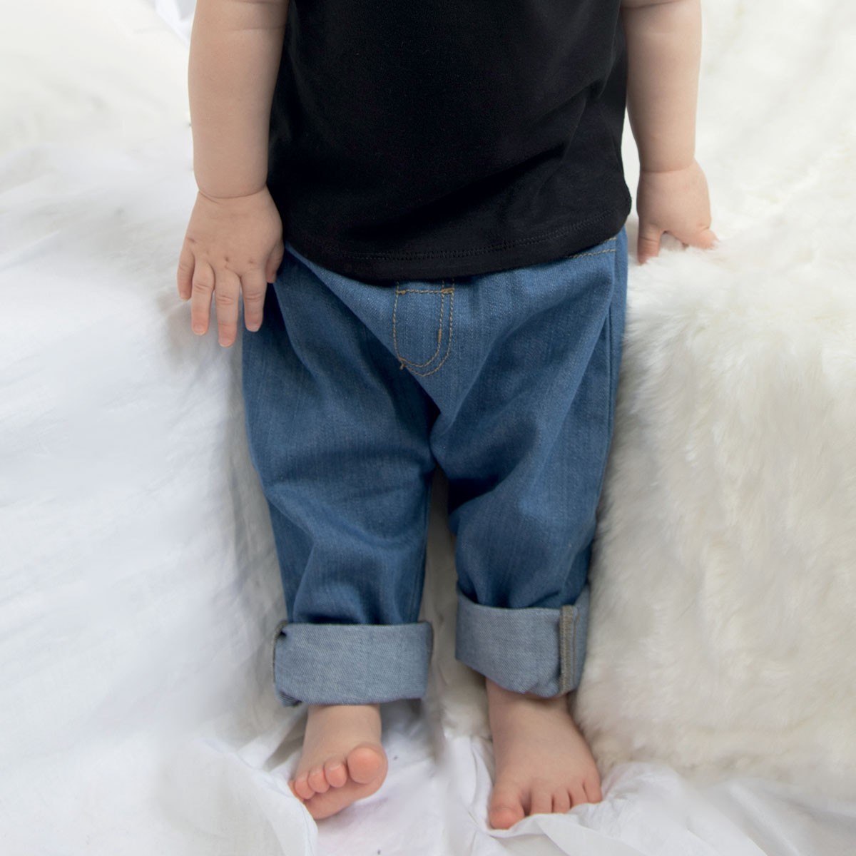 100% cotone organico OCS. Pantaloni da bambino con vita elasticizzata, tasche finte cucite, ampia superficie di decorazione, cavallo basso, orlo dritto, etichetta a strappo.