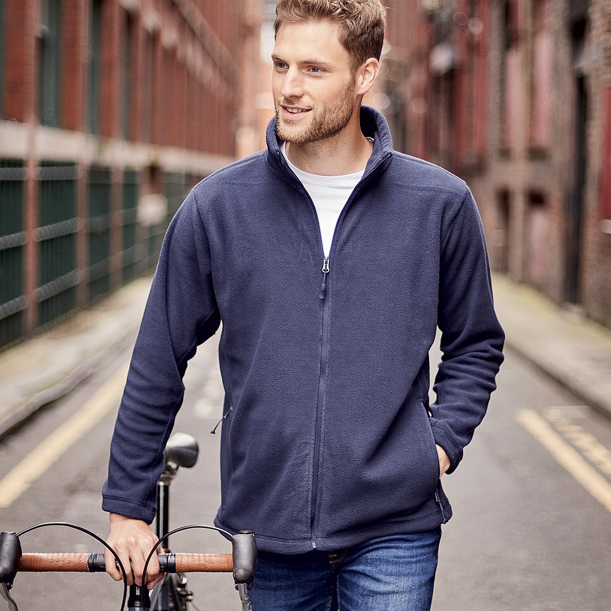 100% poliestere anti-pilling, superficie liscia e compatta, 2 tasche laterali con cerniera, zip intera tono su tono, cor