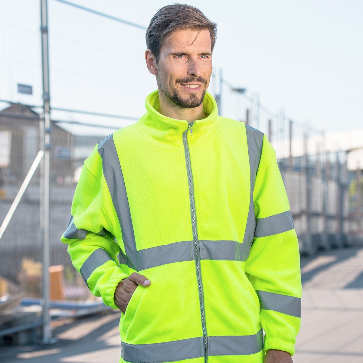 100% poliestere. Giacca in pile ad alta visibilità, conforme alla normativa EN ISO 20471:2013 + A1:2016, Classe 3, Oeko-Tex® Standard 100, colore arancione conforme anche alla normativa GO/RT 3279, EN 343. Due fasce riflettenti da 5 cm intorno al corpo, 1 fascia riflettente su ciascuna spalla e 2 fasce riflettenti su ogni manica, polsini elastici a costine.