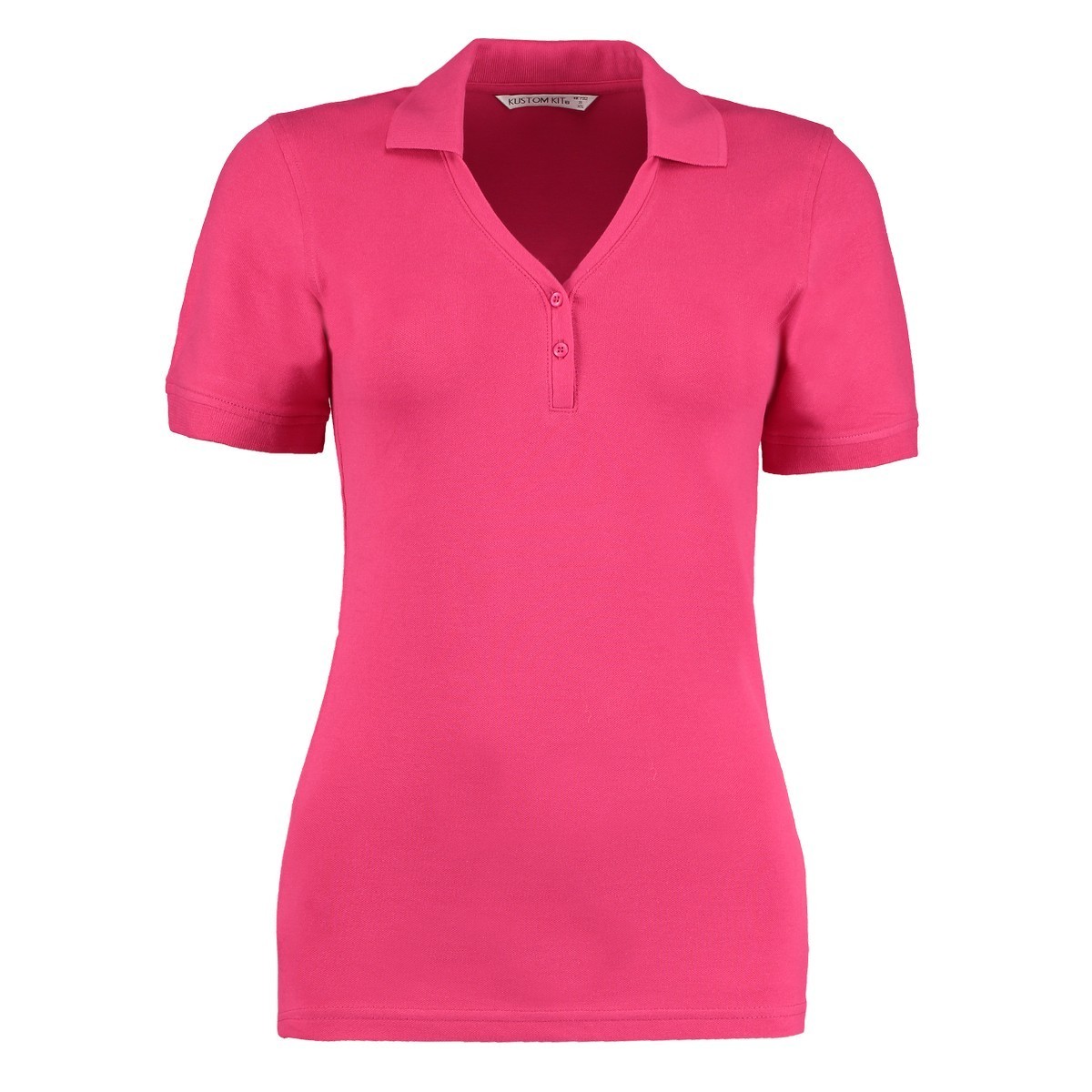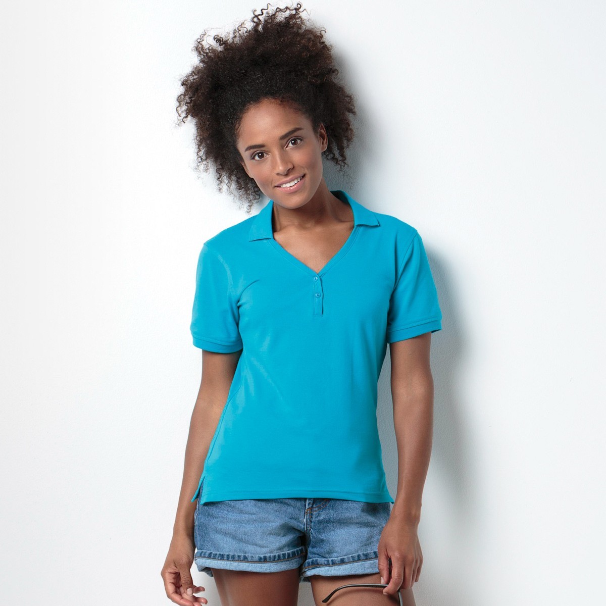 98% cotone, 2% lycra. Polo a maniche corte set-in, colletto e giromanica in costina, scollo a V con 2 bottoni tono su tono, struttura con cuciture e spacchetti laterali, nastro di rinforzo alle spalle.