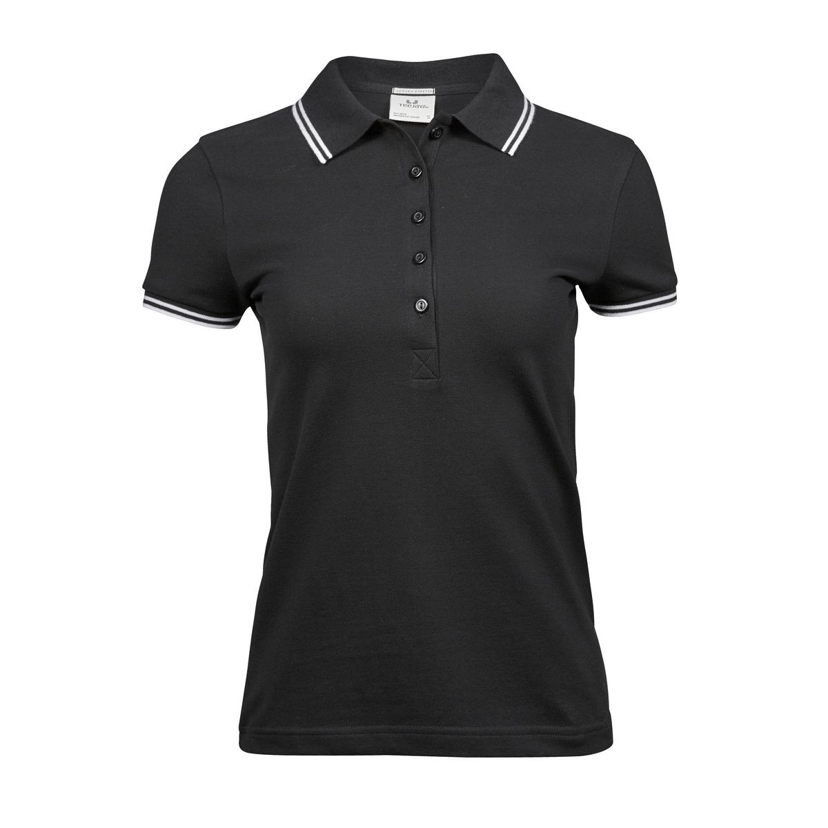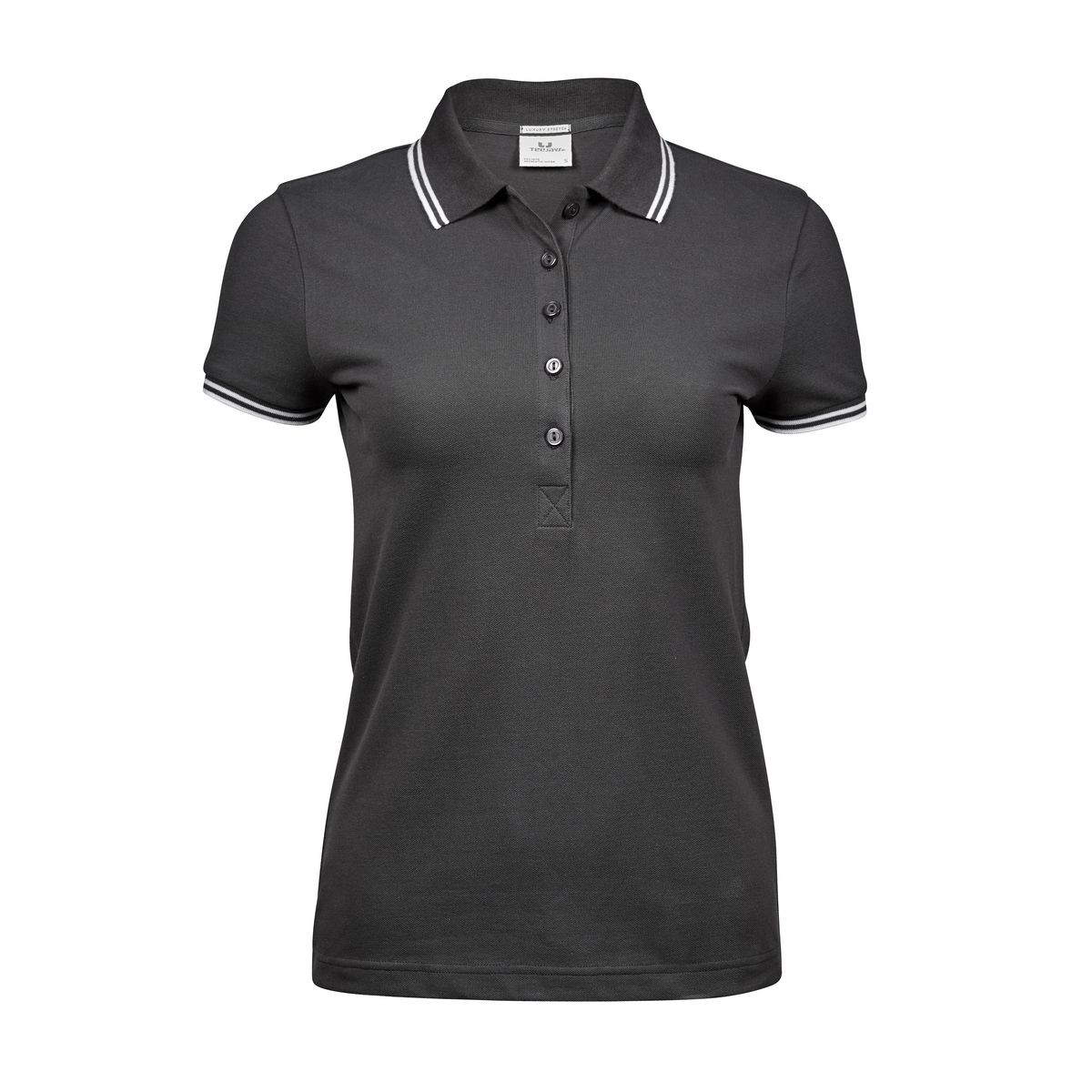 95% cotone ring-spun, 5% elastane. Polo a maniche corte, set-in, mini piqué, doppie righe di colore contrastante su colletto e polsini, struttura con cuciture laterali, 5 bottoni tono su tono.