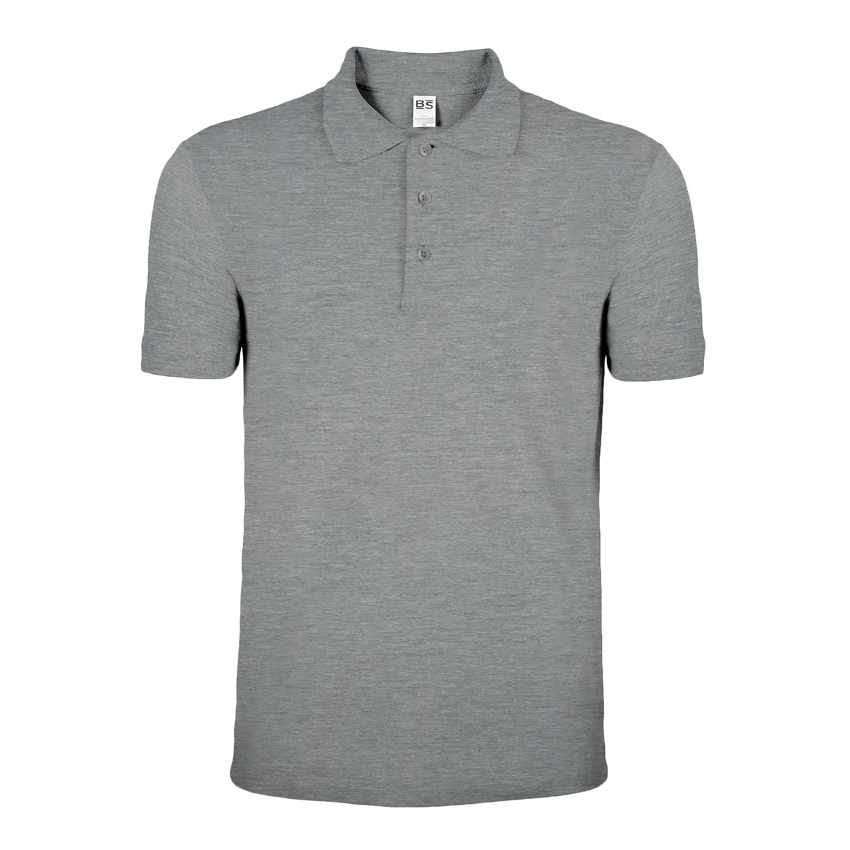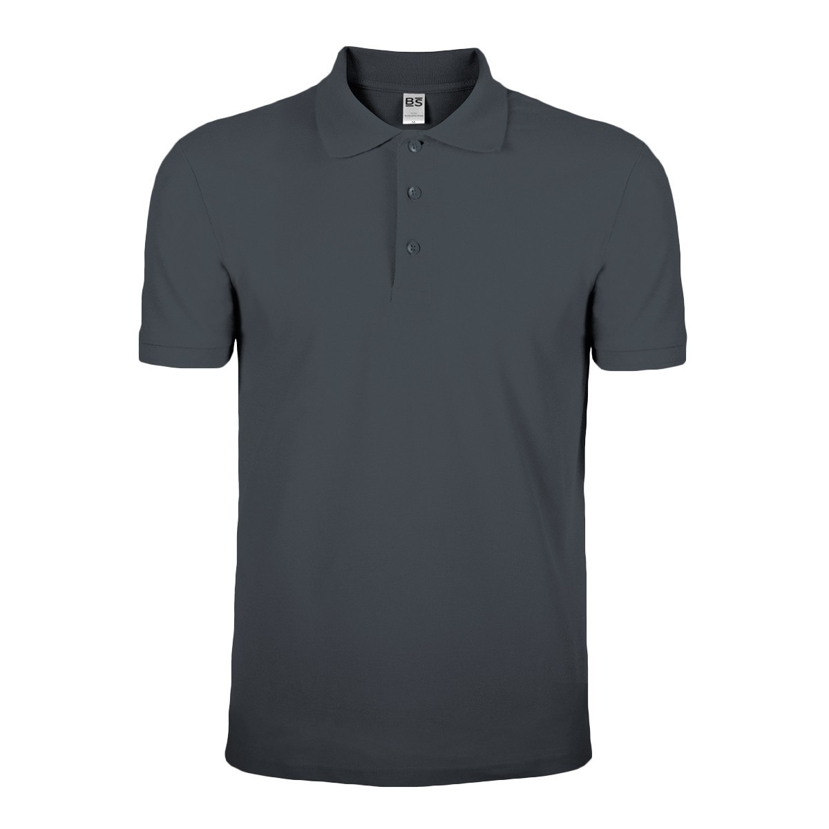 100% cotone piqué. Polo a maniche corte set-in con costine, 3 bottoni tono su tono, nastro di rinforzo al collo, struttura con cuciture e spacchetti laterali. (Col. GY: 85% cot. 15% vis.)