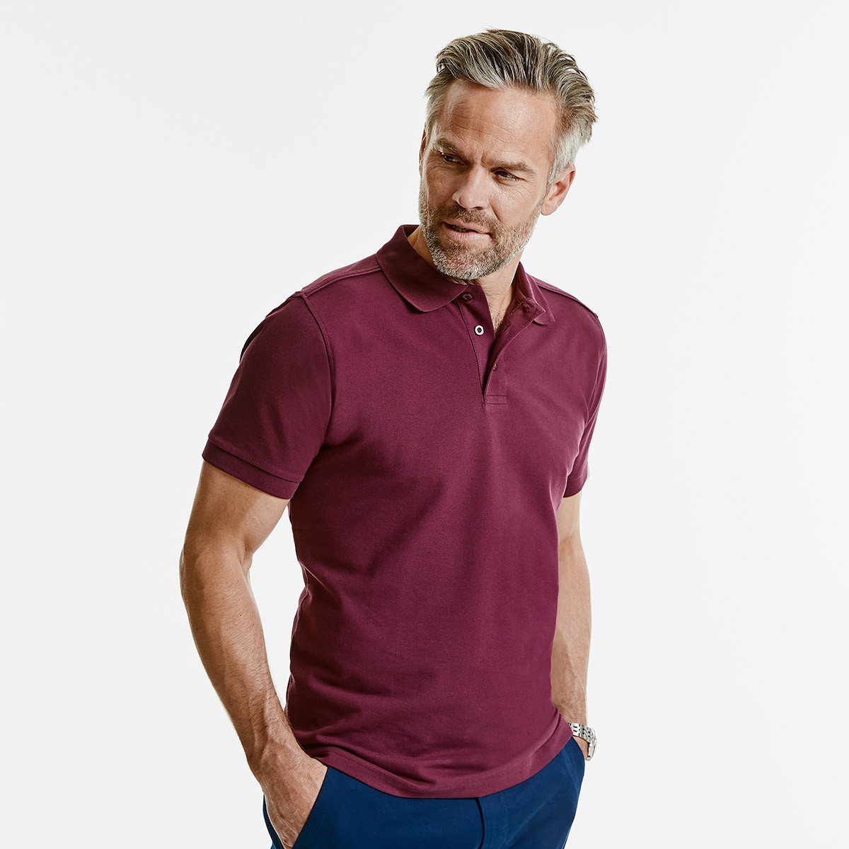 95% cotone 5% lycra. Polo da uomo con struttura a nido d'ape, polsini a coste, spacchetti laterali con fettuccia a spina di pesce. (Col. LX 88% cot. 7% vis 5% Lycra - Col. 30 205g/m).