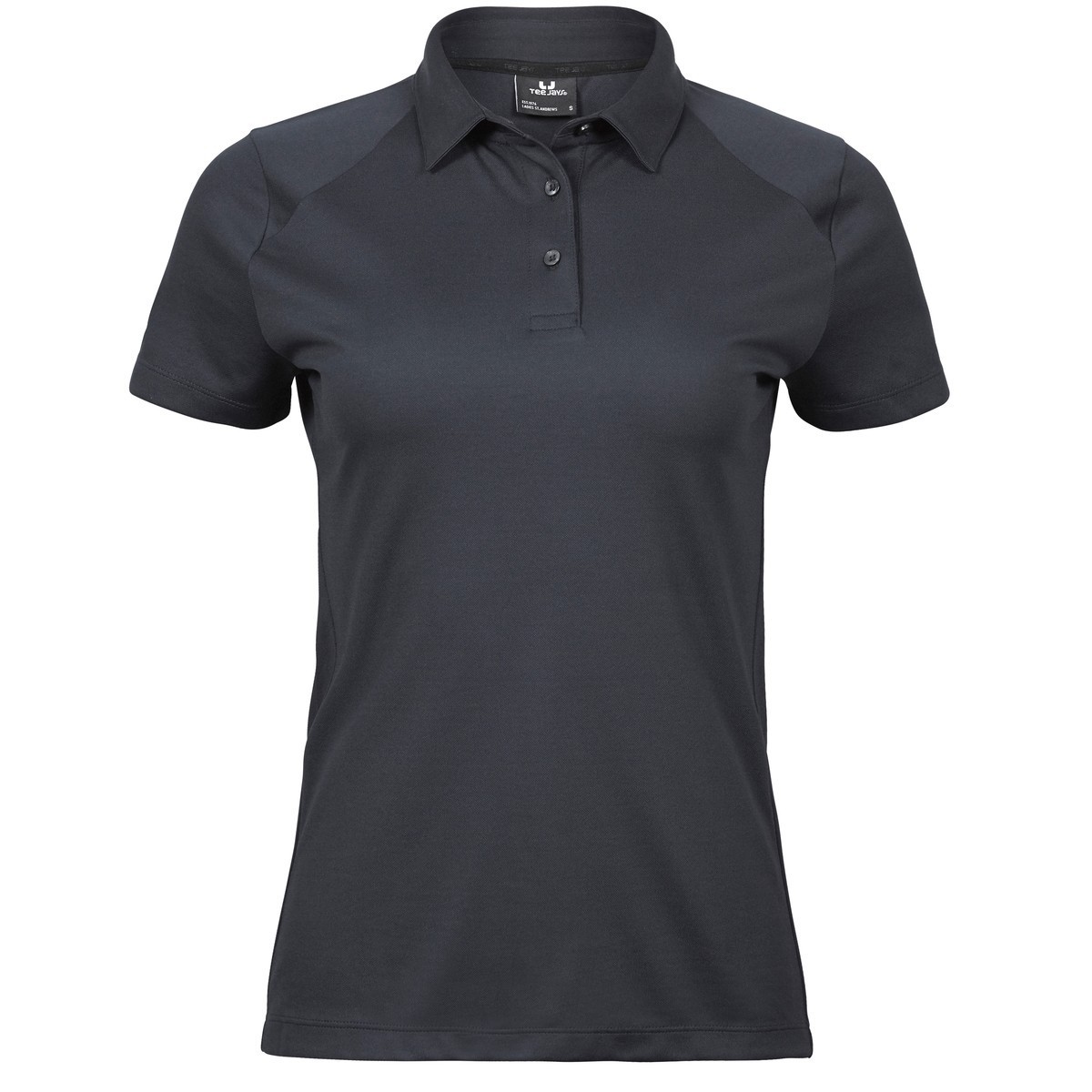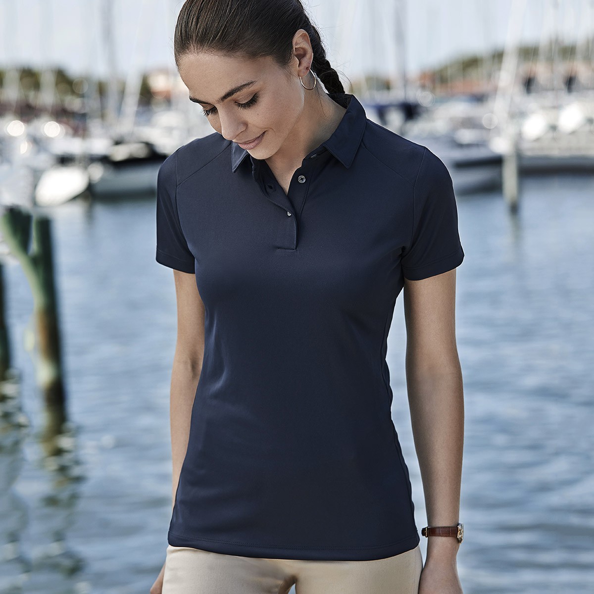 100% poliestere. Polo da donna in tessuto leggero, look sportivo e moderno, colletto foderato in tessuto, bottoni a contrasto color antracite, rifiniture del bordo in tessuto anti-umidità.