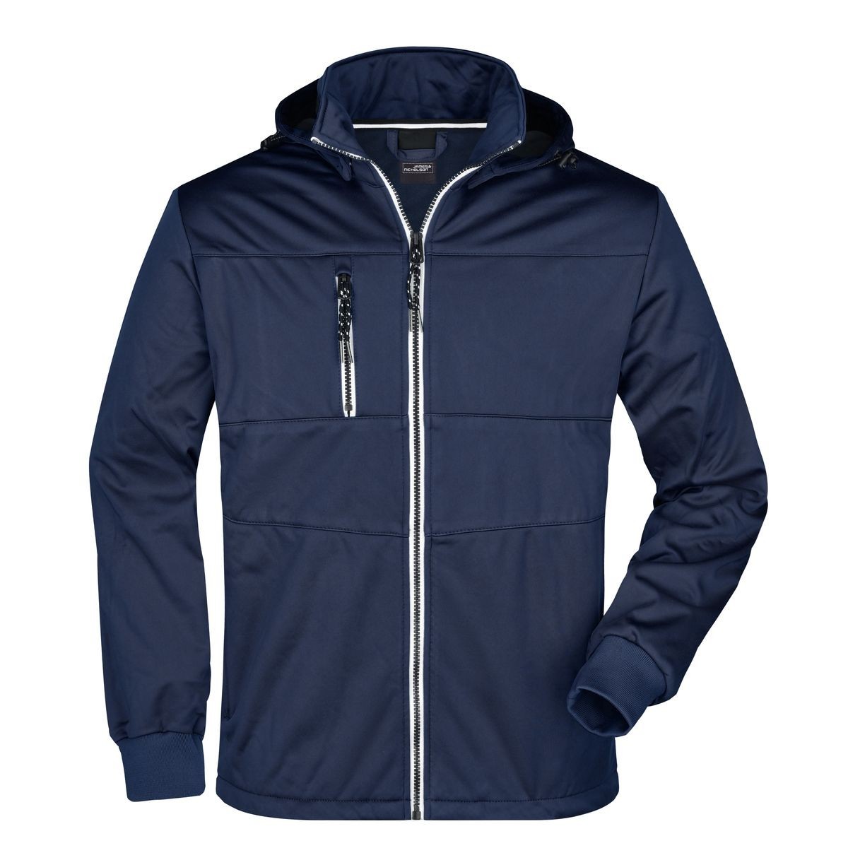100% poliestere. Giacca in softshell in tessuto funzionale a tre strati con membrana TPU, antivento, idrorepellente, traspirante e permeabile al vapore. Cappuccio removibile, due tasche laterali e un taschino interno con cerniera, polsini lavorati a maglia.