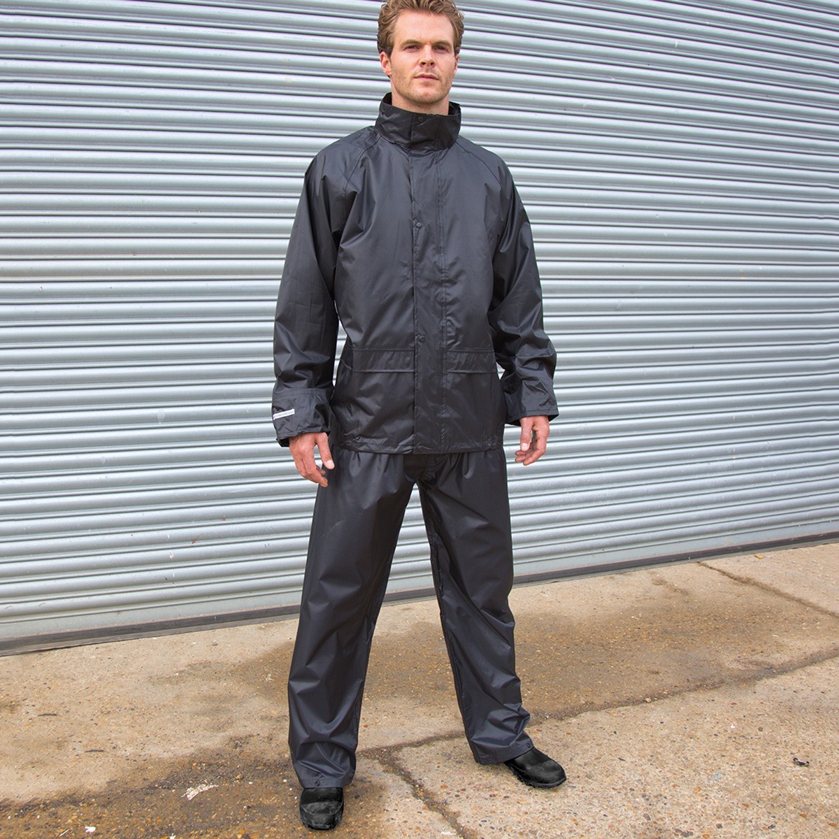100% poliestere. Completo impermeabile e anti- vento. Giacca: cappuccio a scomparsa nel collo, cerniera frontale con protezione per il mento, 2 tasche spaziose, polsini elastici, cuciture nastrate, orlo regolabile con cordino. Pantaloni: due tasche laterali con fessure per accedere facilmente agli indumenti indossati, cuciture nastrate, elastico in vita, chiusura con bottoni automatici regolabili.