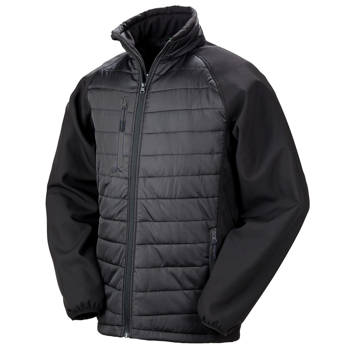 100% poliestere. Softshell impermeabile, tasche con cerniera in contrasto, zip frontale con protezione per il mento, collo e busto imbottiti, polsini morbidi, tiralampo nero, maniche stampabili, etichetta strappabile.