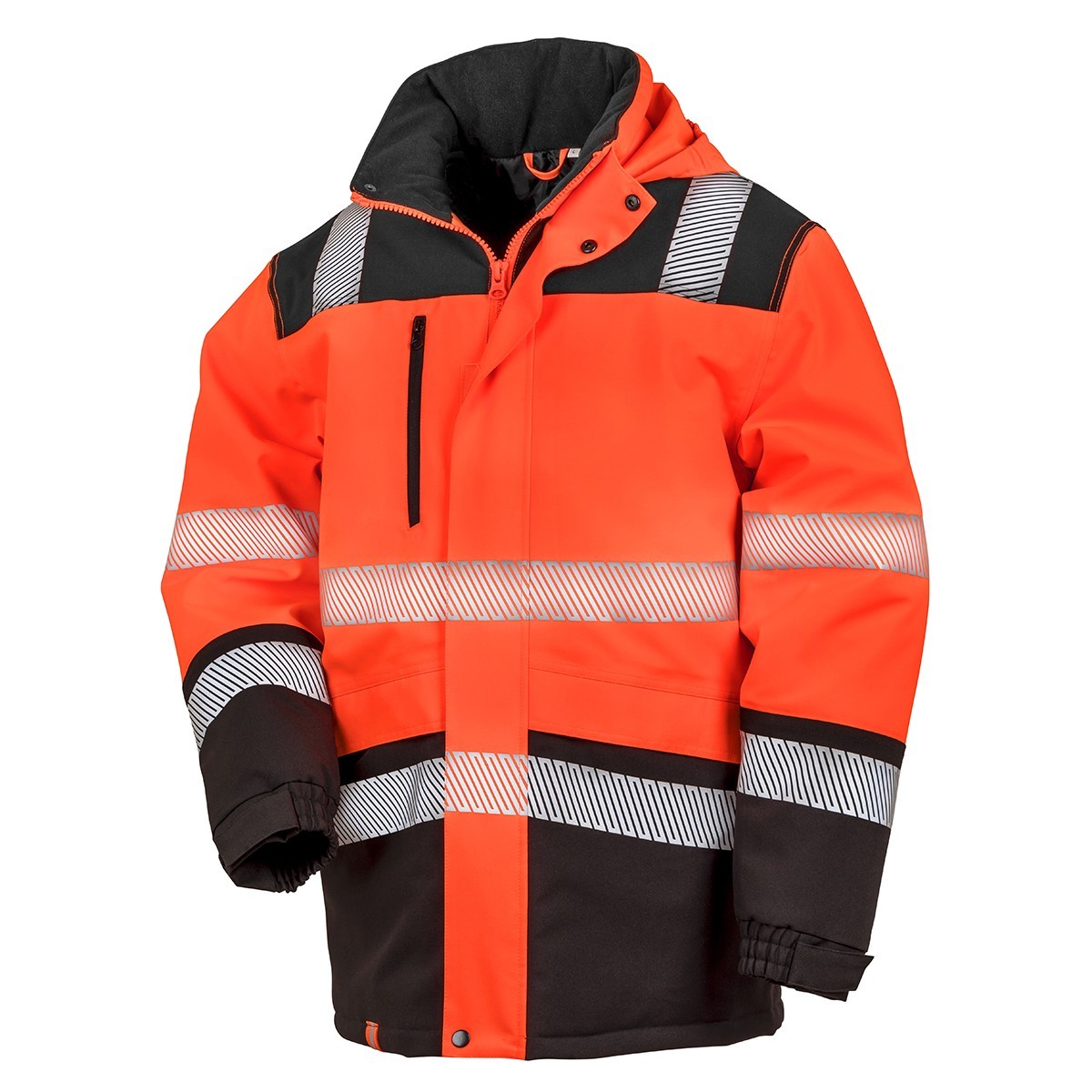 100% poliestere. Giacca impermeabile 8000 mm, antivento, traspirante 3000 mvp, EN ISO 20471: 2013 + A1: 2016 Classe 2, RIS-3279-TOM (solo arancione), polsini regolabili con velcro, parzialmente elasticizzati, finitura morbida riflettente stampata su corpo, spalle e maniche, cappuccio a scomparsa con cordino, tasche esterne con chiusura a strappo, patta di protezione con chiusura a strappo, tasche sul petto con zip, fodera e bordo nero, collo alto, fodera imbottita , cuciture termosaldate, tasca interna, pannelli inferiori più scuri per nascondere lo sporco, pronto per la personalizzazione, senza etichetta.