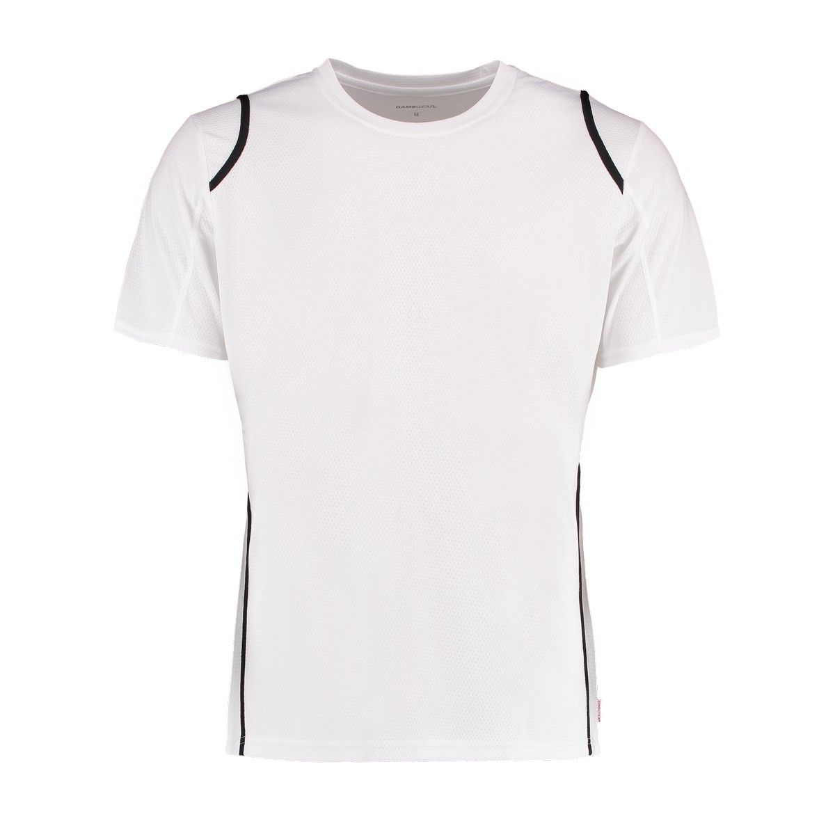 100% poliestere. T-shirt maniche set-in, traspirante, girocollo con fettuccia interna, sottili inserti in contrasto su s