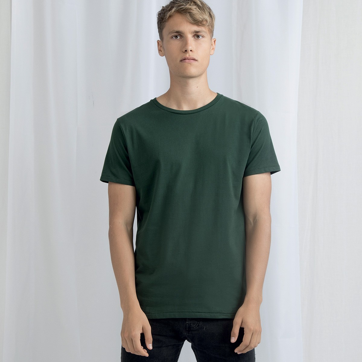 100% cotone single jersey, ring-spun. T-shirt girocollo, maniche corte, orli con cuciture asimmetriche, struttura con cu